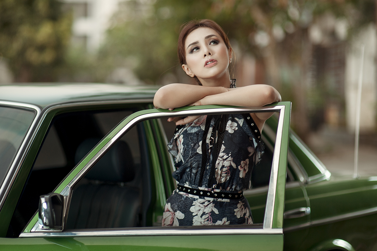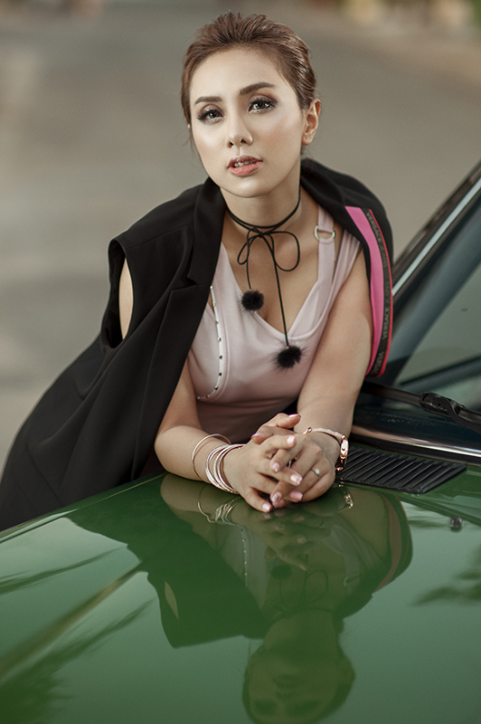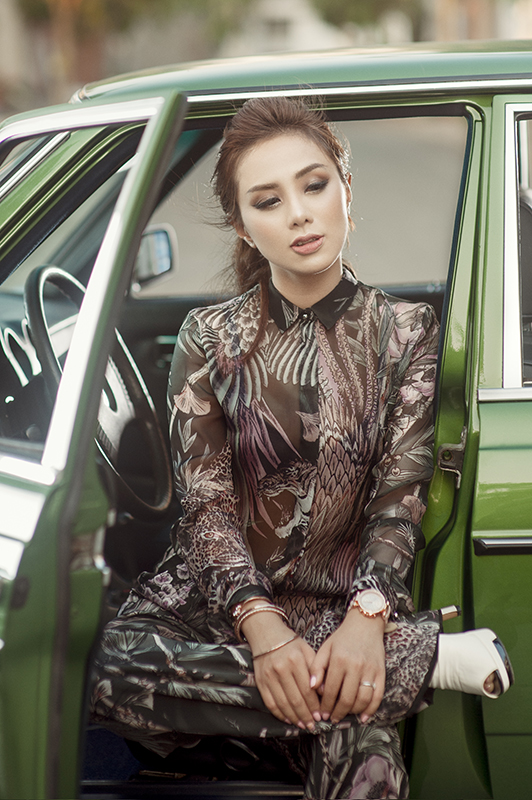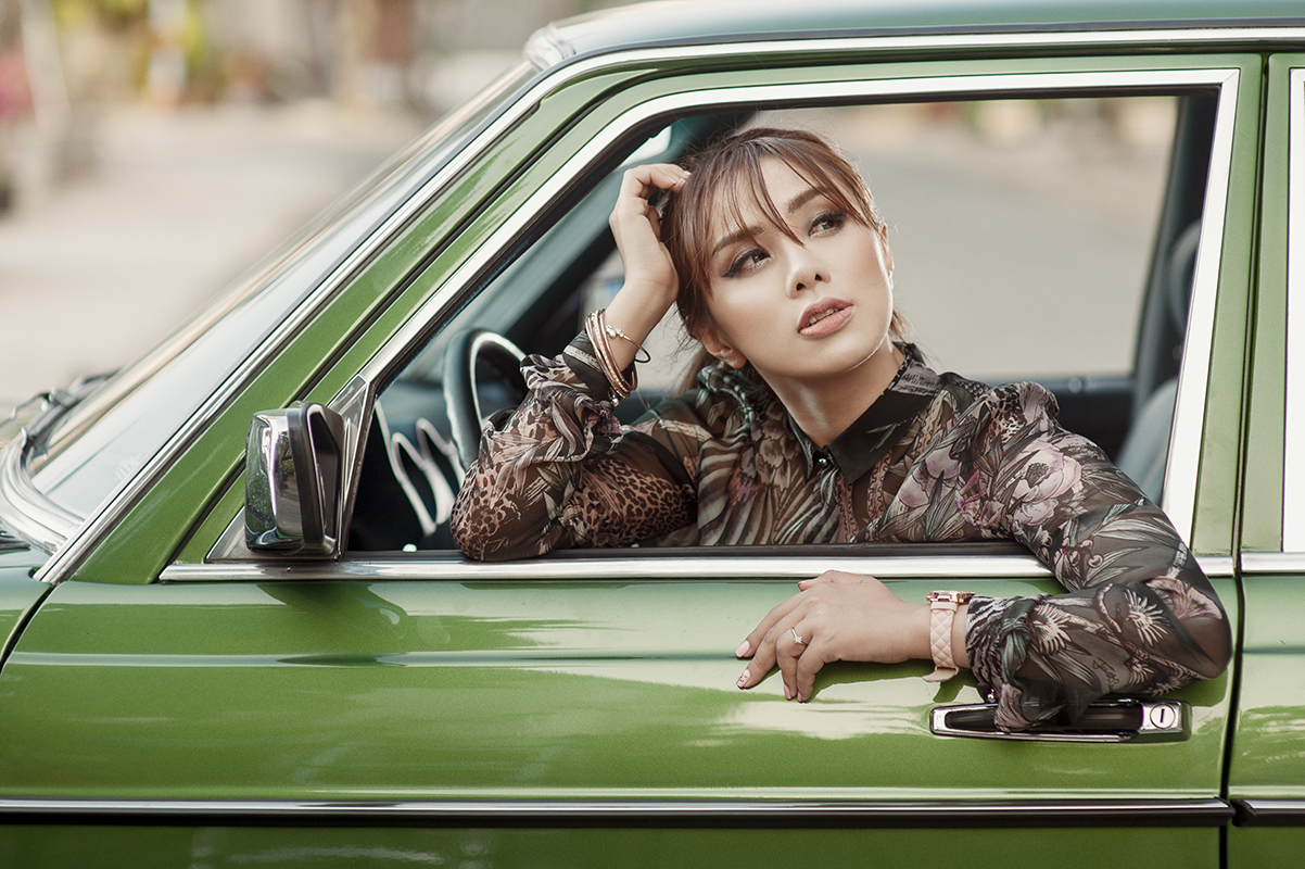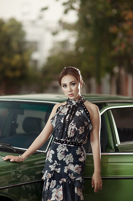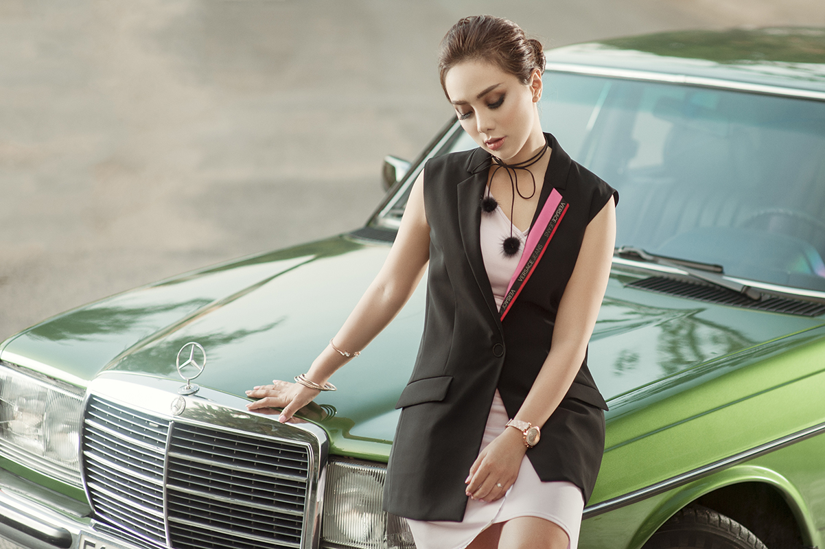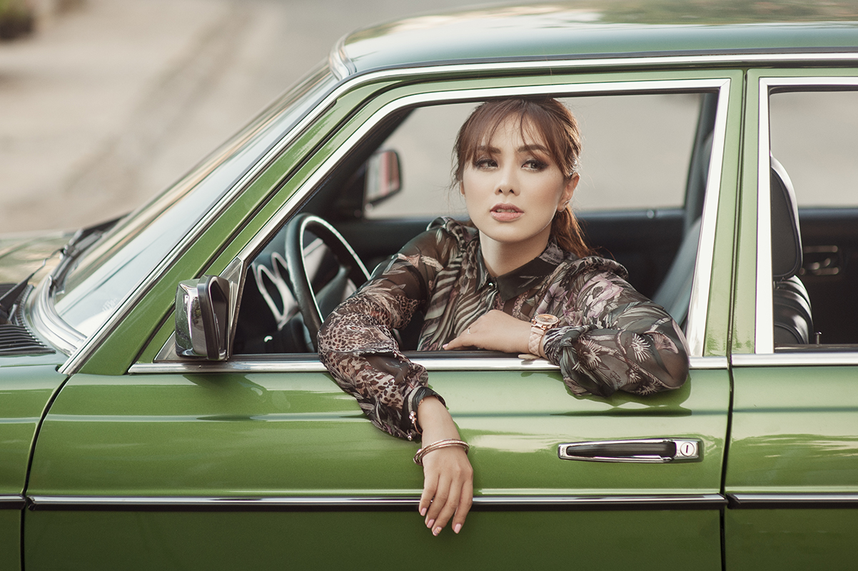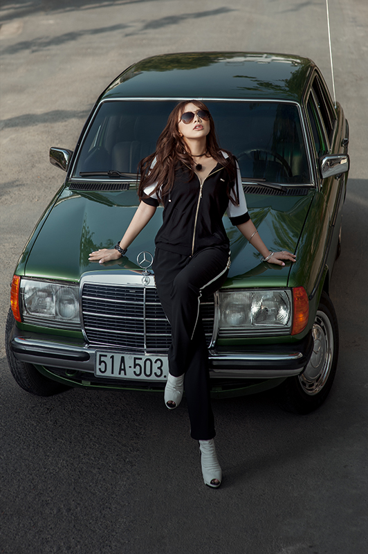Trong bộ hình thời trang mới nhất, nữ ca sĩ 8X chọn tone màu nâu vàng khá retro bên cạnh set giày cao gót hở mũi, phụ kiện gồm lắc tay, choker, đồng hồ… rất thời thượng từ các thương hiệu thời trang cao cấp Liu Jo, Justcavalli, Versace Jeans. Điểm nhấn hoàn hảo cho bộ ảnh thêm ấn tượng chính là chiếc Mercedes E200 đời 1987 màu xanh rêu với kính bấm, chạy số tự động.