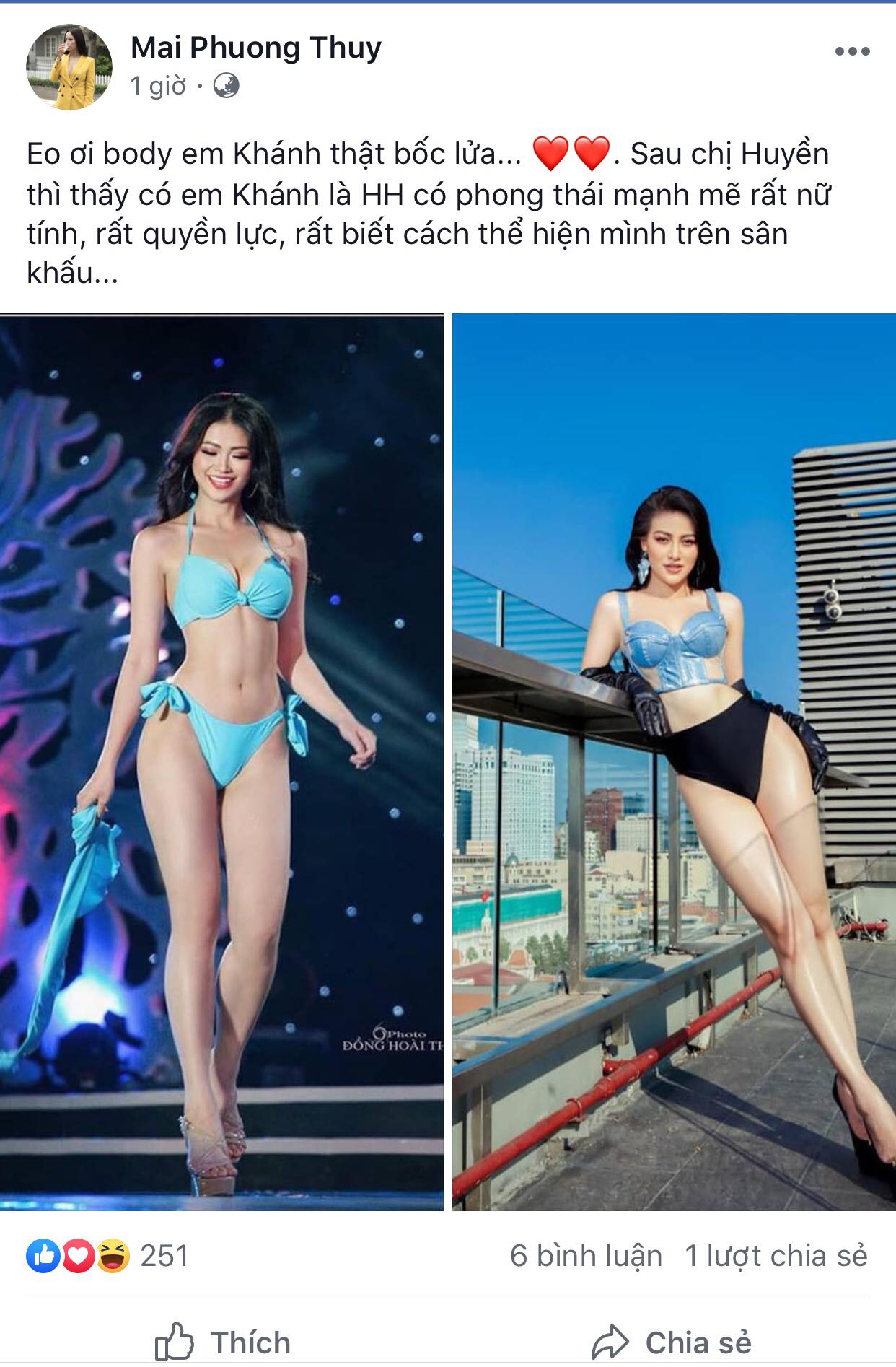 Cụ thể, cựu Hoa hậu Việt Nam 2006 đăng hai bức ảnh của Phương Khánh trong trang phục áo tắm kèm theo đó là dòng chia sẻ “Eo ơi body em Khánh thật bốc lửa. Sau chị Huyền thì thấy có em Khánh là Hoa hậu có phong thái mạnh mẽ rất nữ tính, rất quyền lực, rất biết cách thể hiện mình trên sân khấu…”