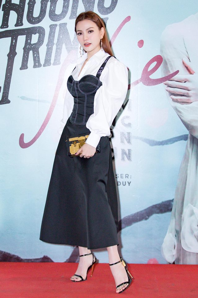 Trong một sự kiện khác, Thu Thủy diện đầm cúp ngực đen và áo sơ mi trắng tay bồng cực hiện đại.
