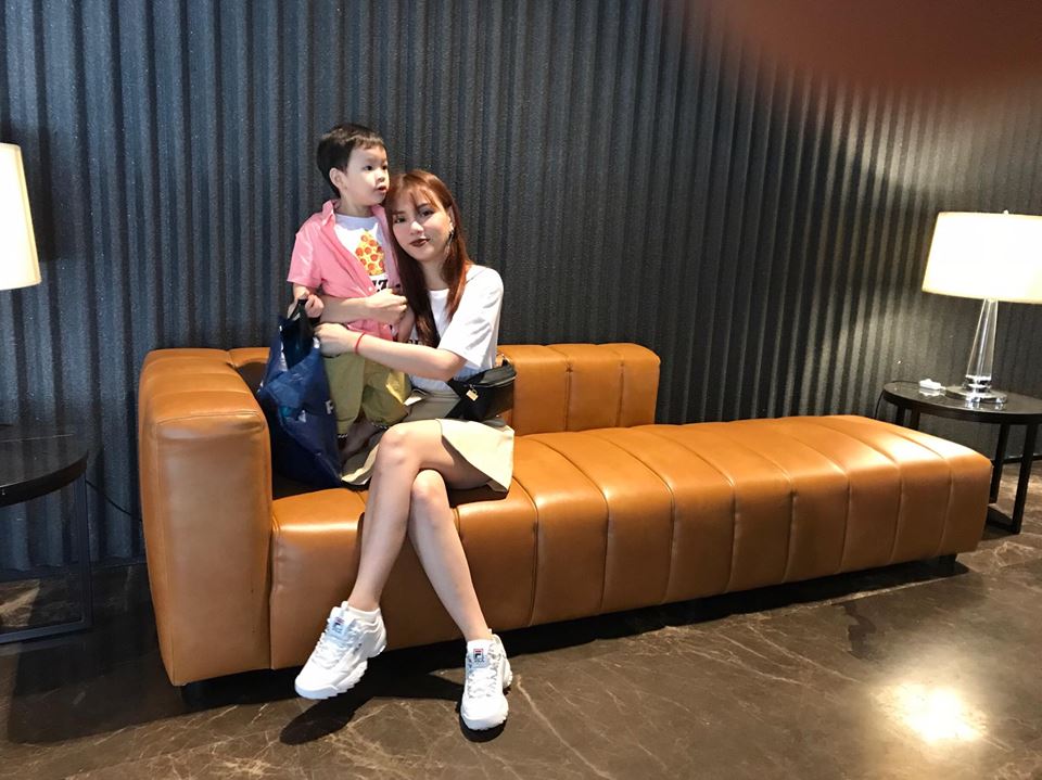 Đi chơi cùng cậu con trai đáng yêu, Thu Thủy diện váy ngắn và áo thun trắng đơn giản cùng giầy sneaker trắng