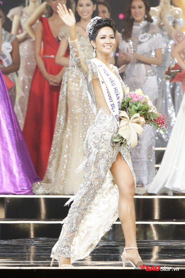 Trong phần thi trang phục dạ hội, với hiệu ứng quá tốt ở chiếc váy vàng xẻ tà tại đêm bán kết, các fan sắc đẹp hoàn toàn trông đợi, mong ngóng vào bộ cánh mà H'Hen Niê sẽ đem đến cho phần thi chung kết quan trọng. Không khiến mọi người thất vọng, thiết kế ôm sát, đính đá lấp lánh và xẻ cao phía trước chính là món đồ được cô lựa chọn.