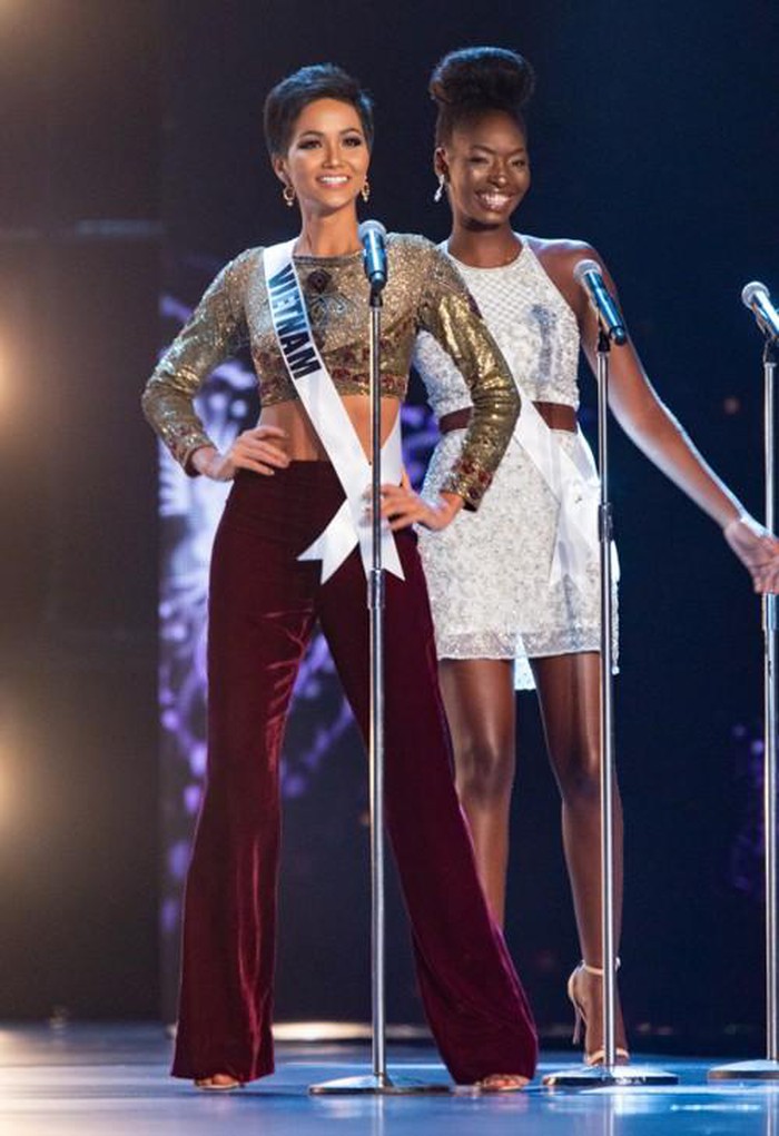 4. Trong phần thuyết trình giới thiệu bản thân, H’Hen Niê một lần nữa khiến giới mộ điệu vỡ òa khi lựa chọn cho mình bộ cánh hoàn toàn khác với những thí sinh còn lại. H’Hen Niê là thí sinh duy nhất mặc quần giữa dàn thí sinh trưng dụng váy ngắn gợi cảm.