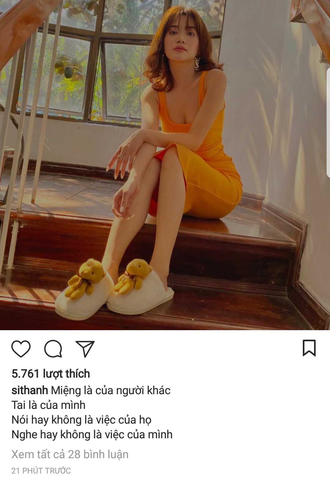 Diện chiếc váy ôm sát, chân mang đôi dép cực kỳ đáng yêu, Sĩ Thanh khoe được hết mọi lợi thế hình thể của mình. Bên cạnh đó, cô nàng còn gây chú ý khi đăng tải dòng caption nói về việc tiếp nhận ý kiến từ người xung quanh, dễ khiến khán giả liên tưởng đến việc không hay xảy ra gần đây.
