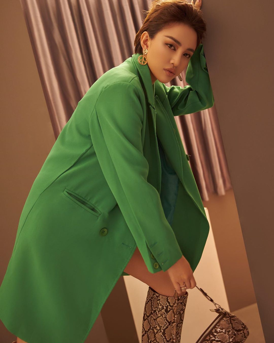Thiên Nga The Face gây ấn tượng với cách sử dụng phụ kiện da động vật, nổi bật trên outfit tông xanh mát mắt.