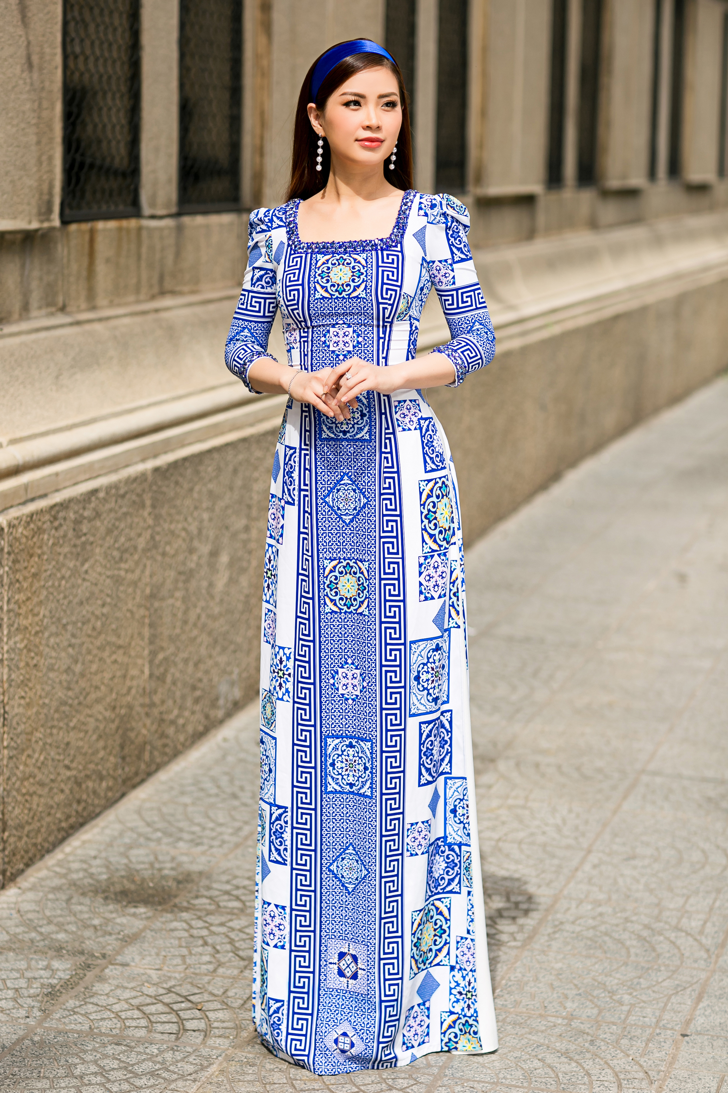 Với áo dài họa tiết gạch tông màu xanh trắng, cả 2 nàng á hậu cùng lựa chọn chiếc khăn màu xanh duyên dáng hợp tông. Phom dáng ôm sát của chiếc áo dài cũng giúp các người đẹp khoe được hình thể chuẩn.