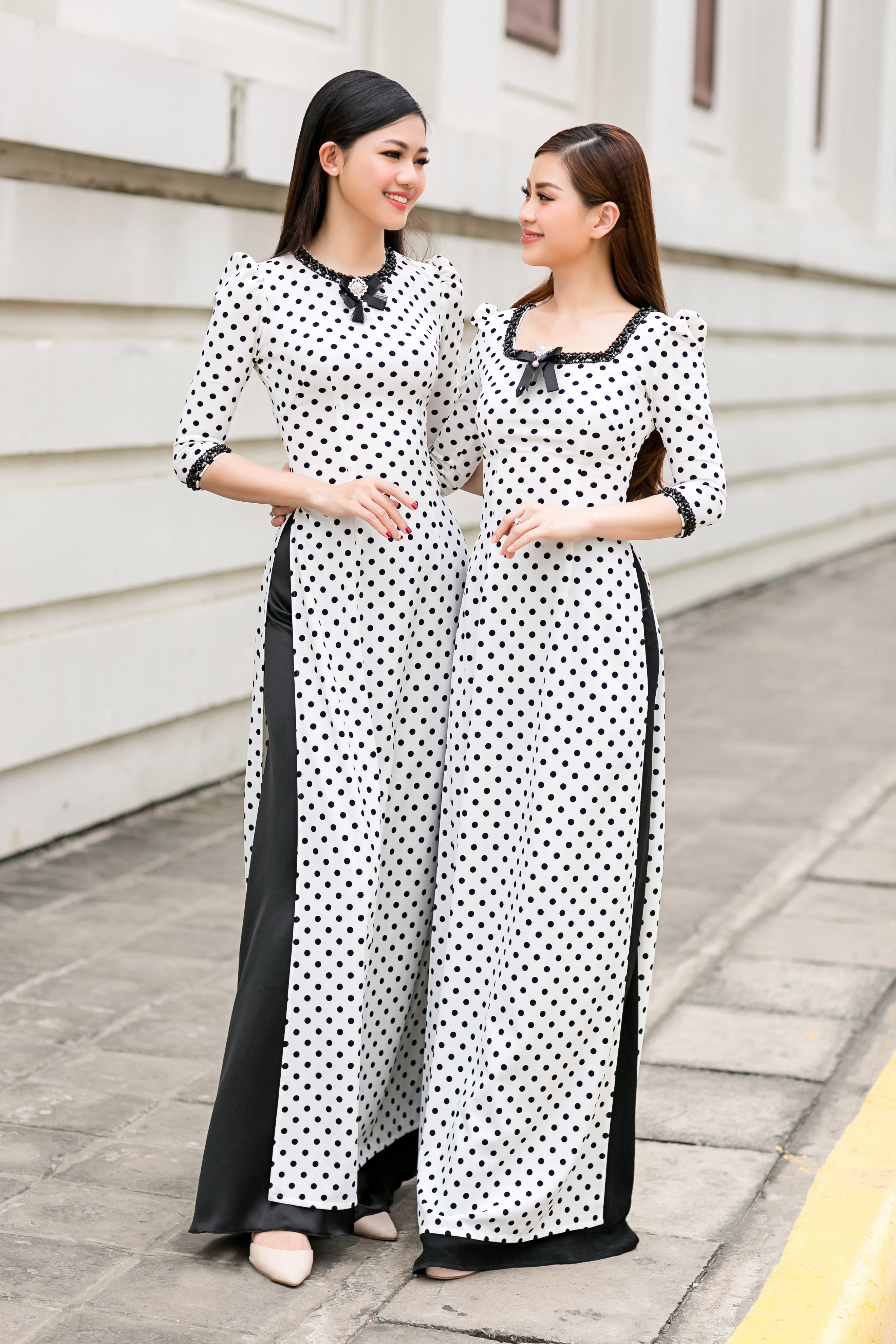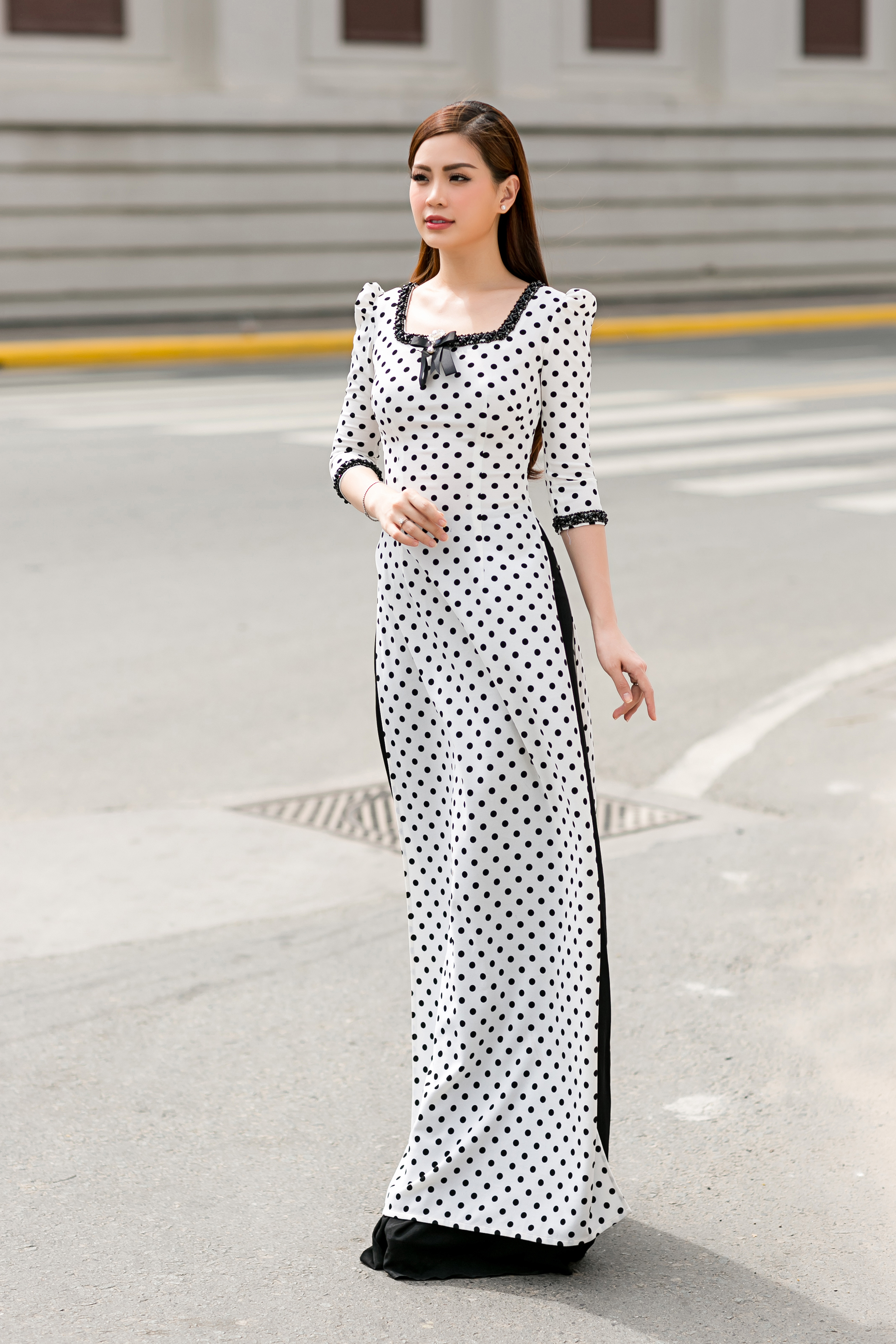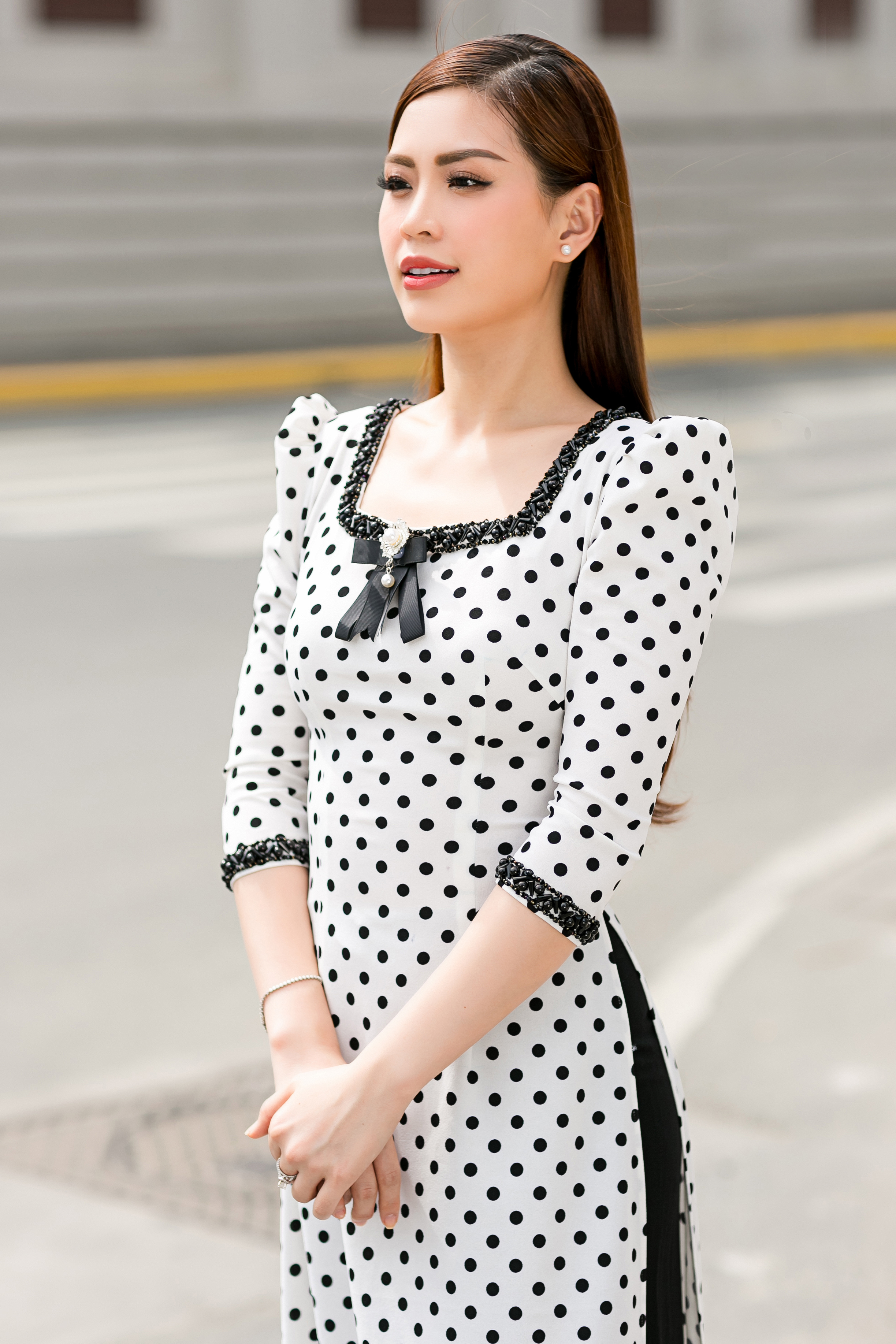 Không chỉ Diễm Trang, á hậu Thanh Tú cũng lựa chọn tà áo dài chấm bi này để trở nên duyên dáng trên phố.