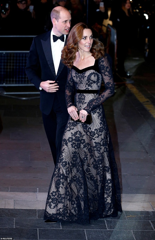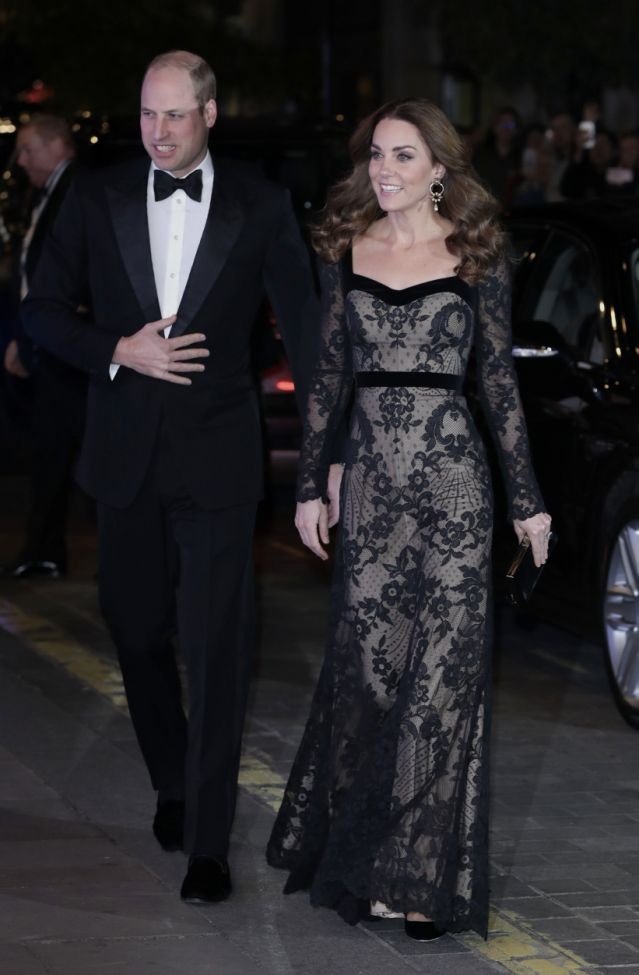 Xuất hiện trước nhà hát London Palladium, cặp vợ chồng Hoàng gia Anh Hoàng tử William cùng Công nương Kate Middleton đã chọn trang phục tông màu đen cùng nhau tham dự một sự kiện. Nữ Công tước xứ Cambridge chọn bộ váy chất liệu sheer và ren xuyên thấu nền nã đến từ nhà mốt Alexander McQueen.
