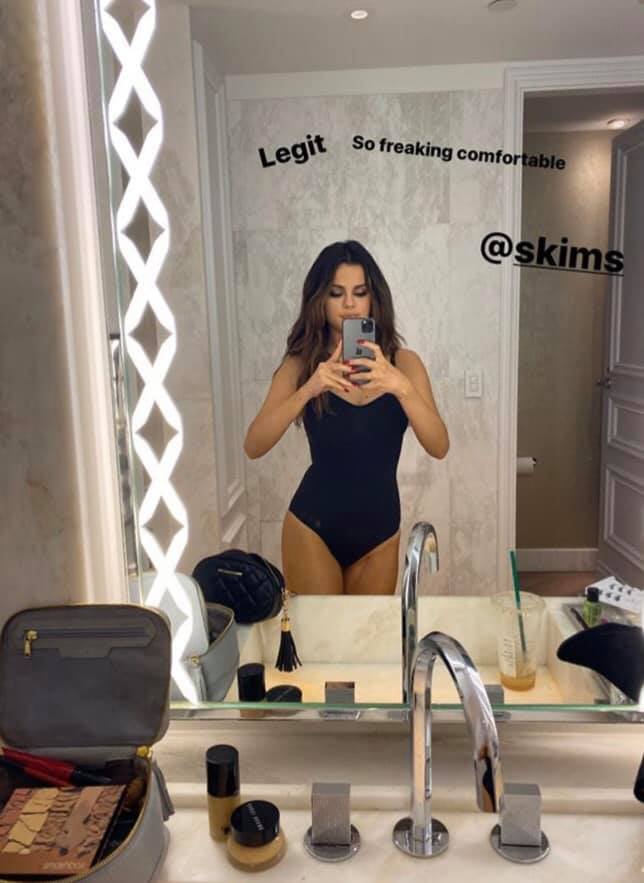 Không những thế, Selena Gomez mới đây nhất còn ủng hộ Kim Kardashian khi order trang phục nội y định hình Skims màu đen để mặc
