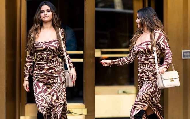 Set đồ thứ hai là chiếc váy nâu dài họa tiết loang lổ , tuy nhiên đôi boots đen lại làm “dìm dáng” của Selena , khiến cô trông bị lùn đi một mẫu