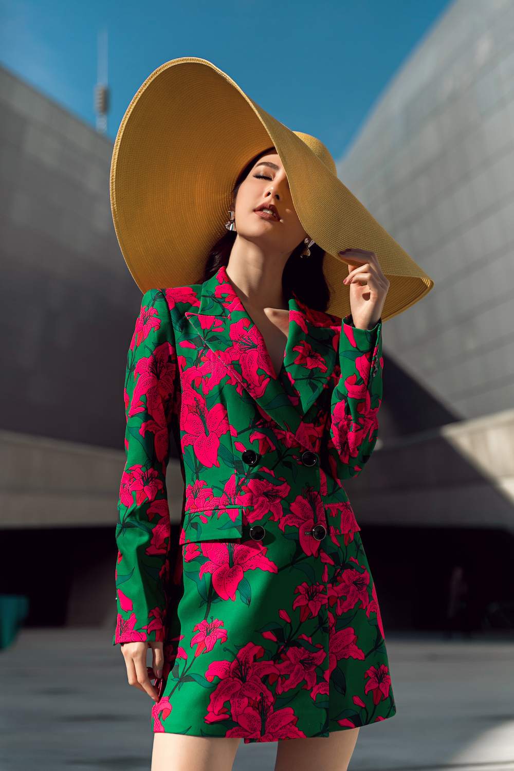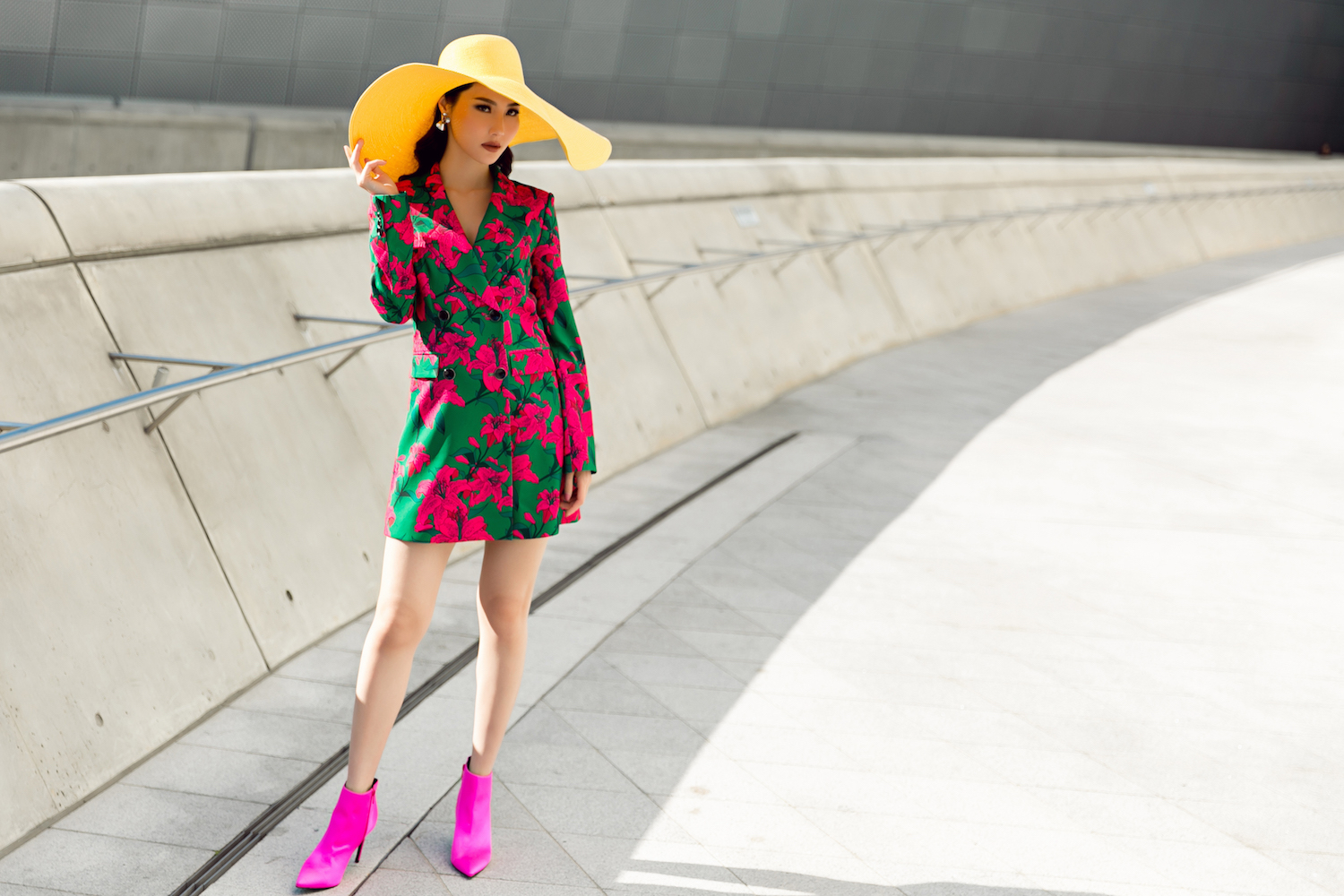 Trang phục thứ hai tới từ NTK Đỗ Mạnh Cường, áo vest xanh họa tiết hoa đỏ hai hàng cúc mang hơi hướng menswear với mốt “giấu quần”, kết hợp với đôi bốt hồng neon cực kì nổi bật.
