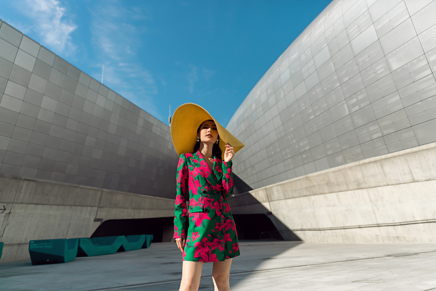 Xu hướng Color Block được ứng dụng “cực chất” khi kết hợp với chiếc mũ rộng vành vàng nghệ, khiến nữ diễn viên vừa có sự mạnh mẽ, vừa có nét quyến rũ bí ẩn.