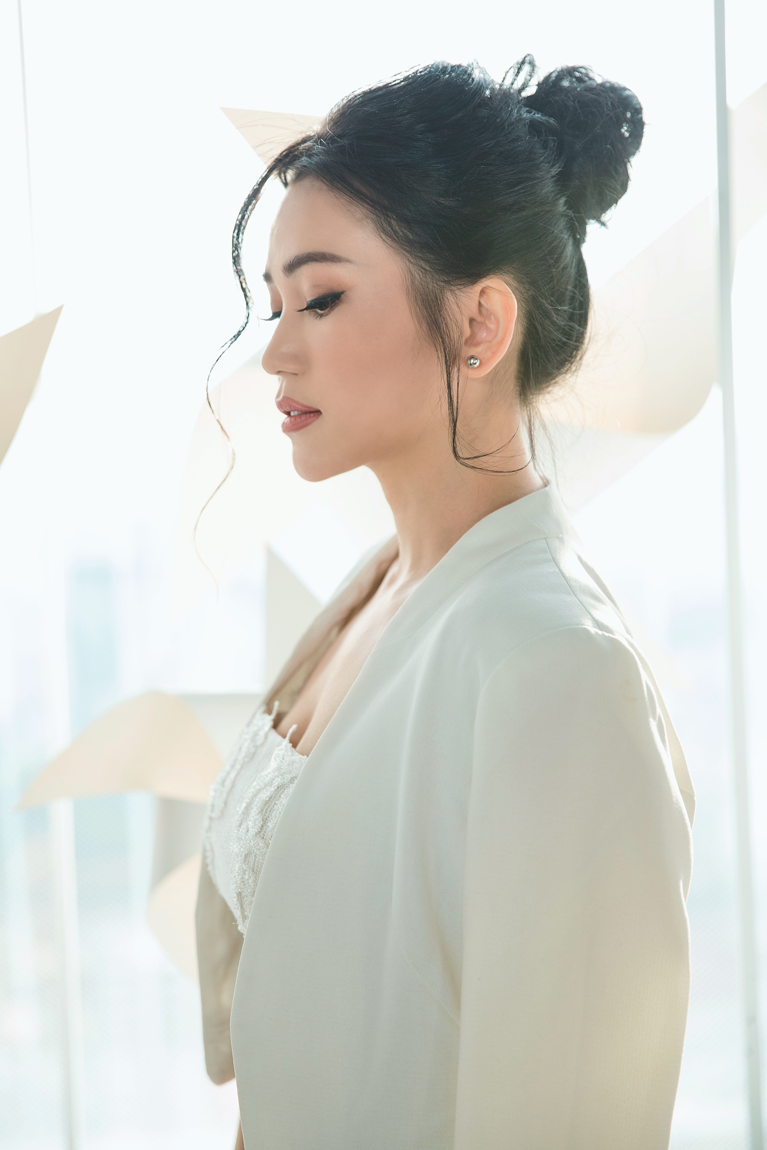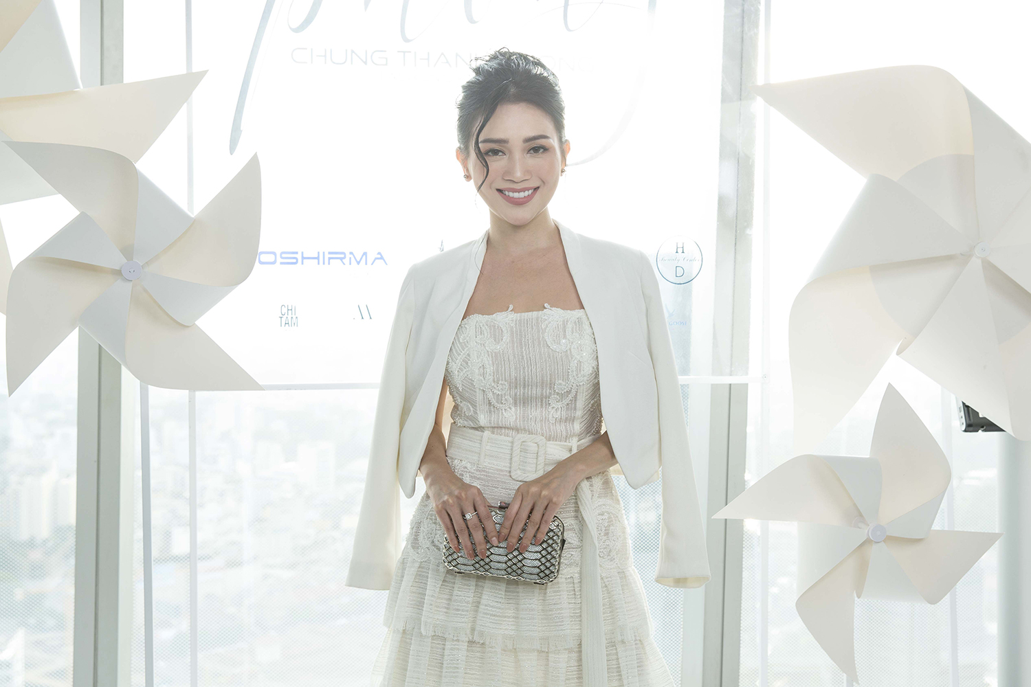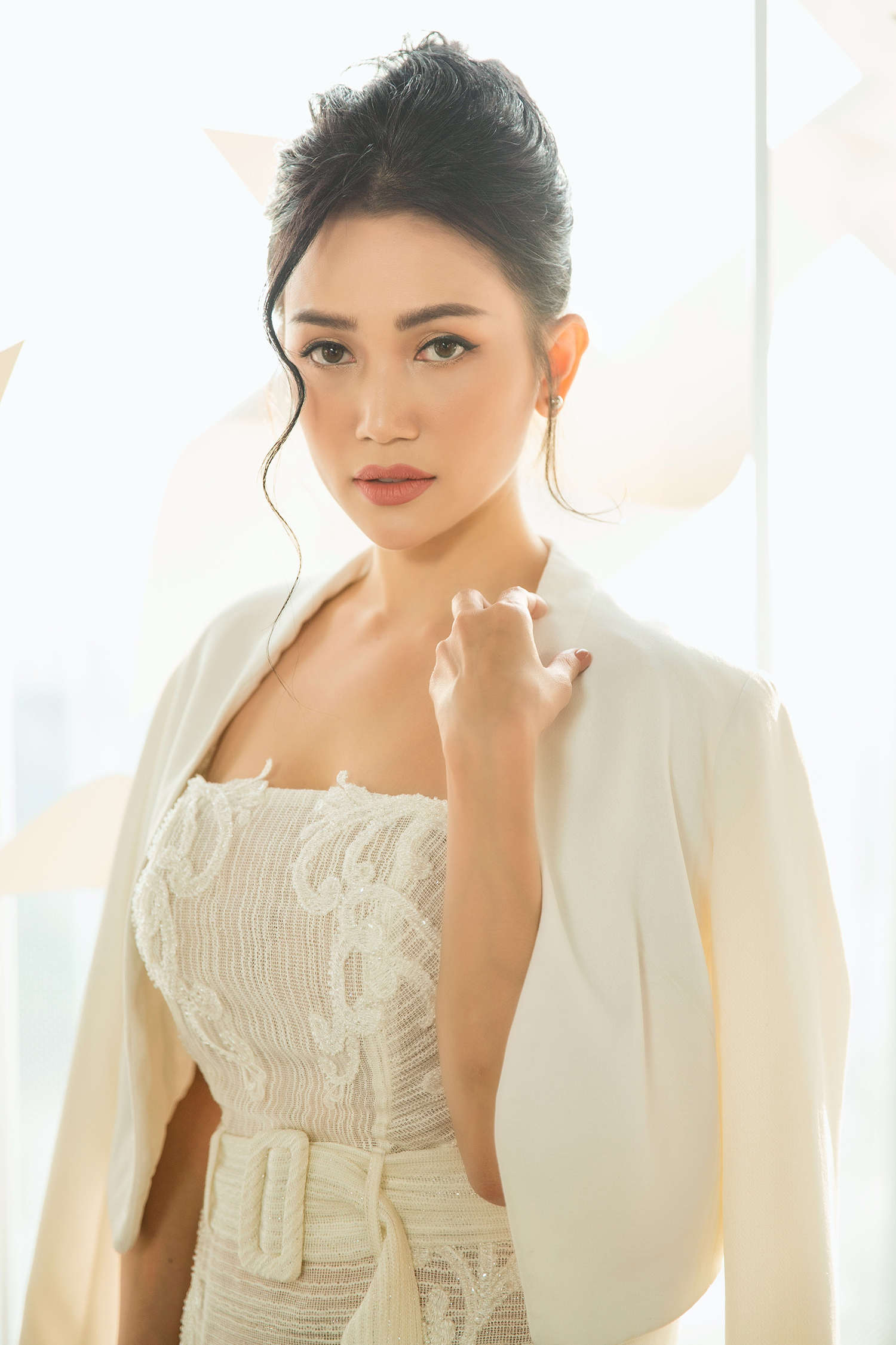 Bên ngoài thiết kế trắng chất ren cao cấp, Sĩ Thanh khoác thêm chiếc áo vest phom vừa vặn với vóc dáng nhỏ nhắn của mình.