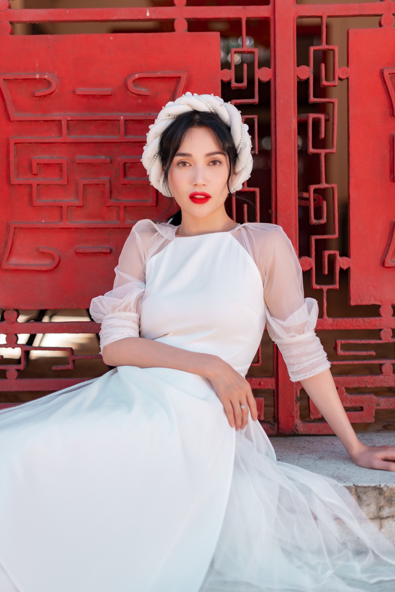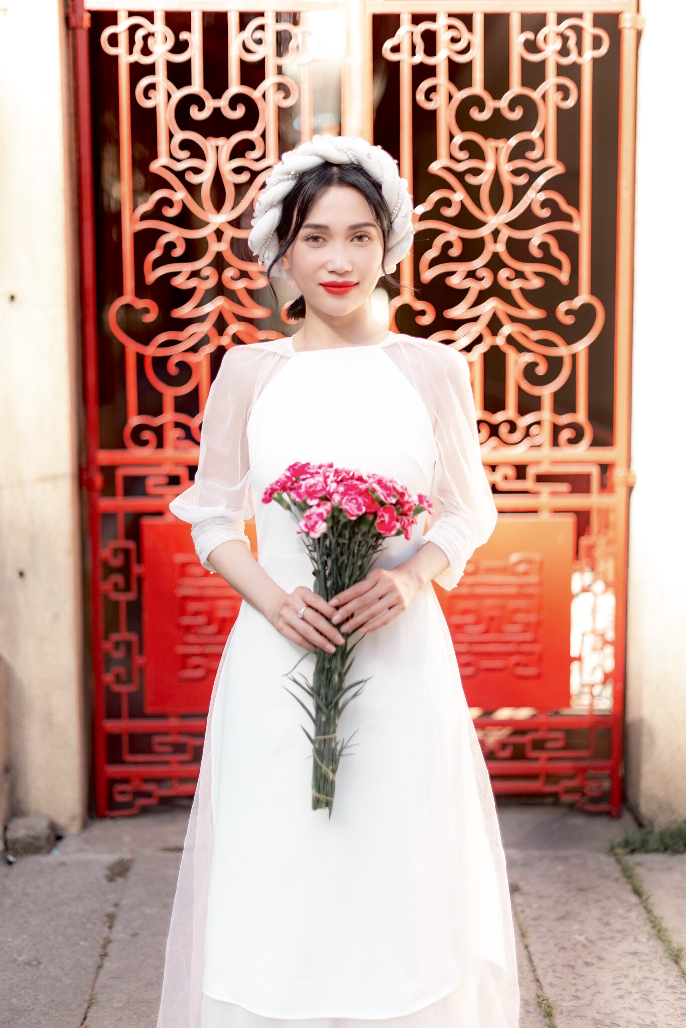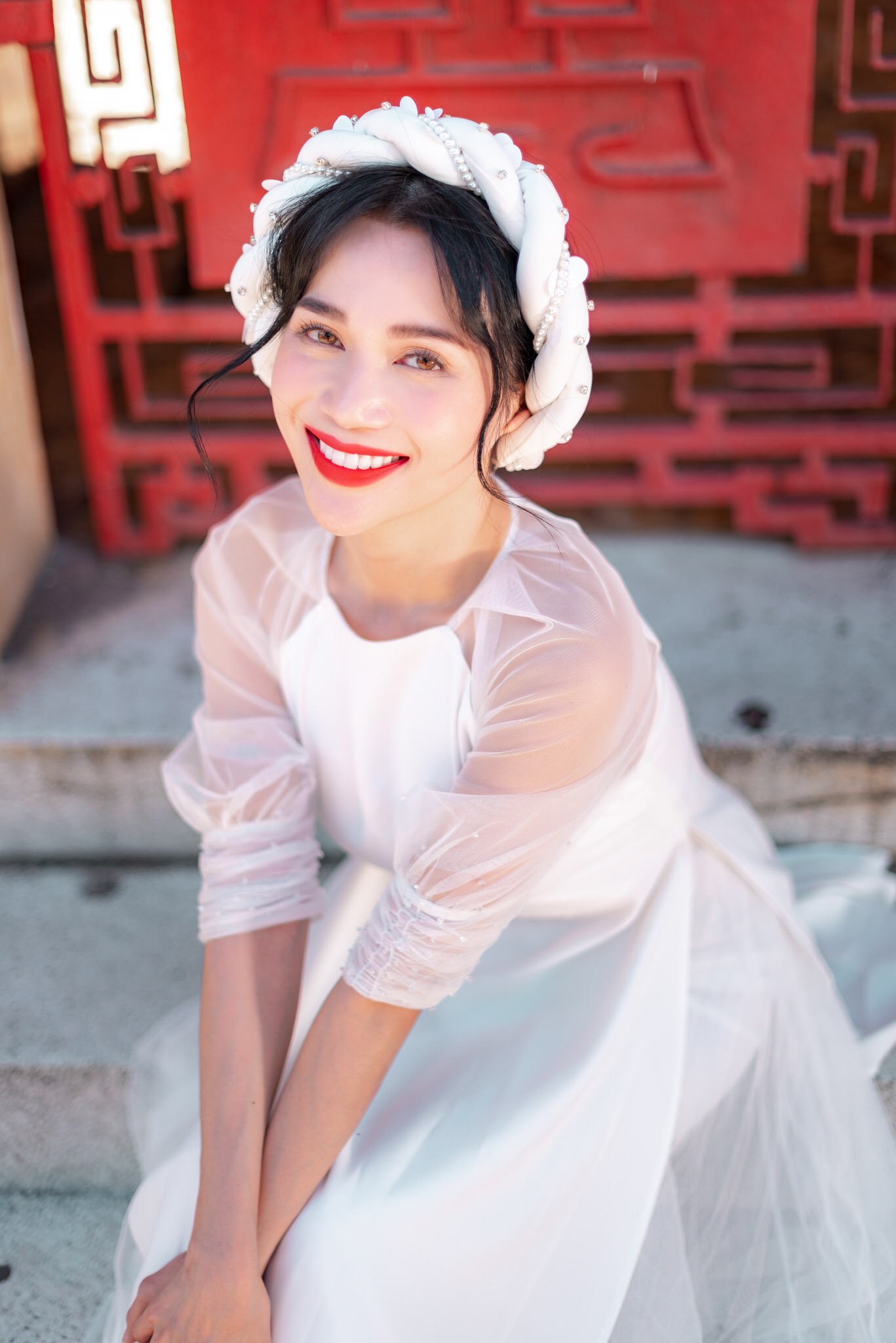 Trong bộ ảnh lần này, Sĩ Thanh diện hai bộ áo dài tông màu trắng đỏ, hai gam màu quen thuộc của Tết. Đặc biệt, thiết kế áo dài Sĩ Thanh chọn mang dáng dấp nữ tính và cổ điển.