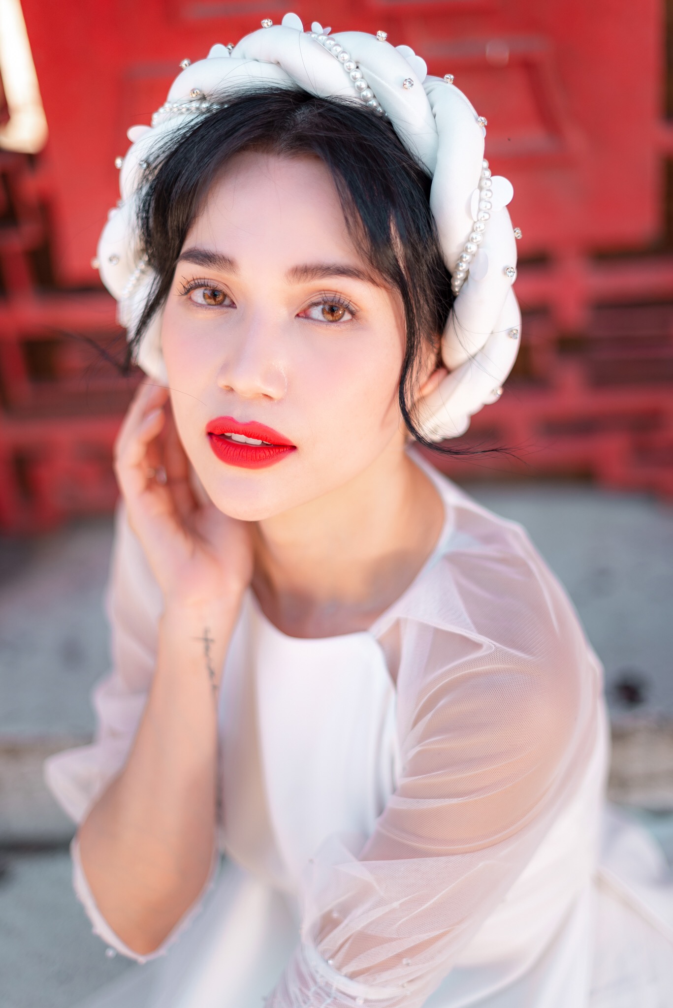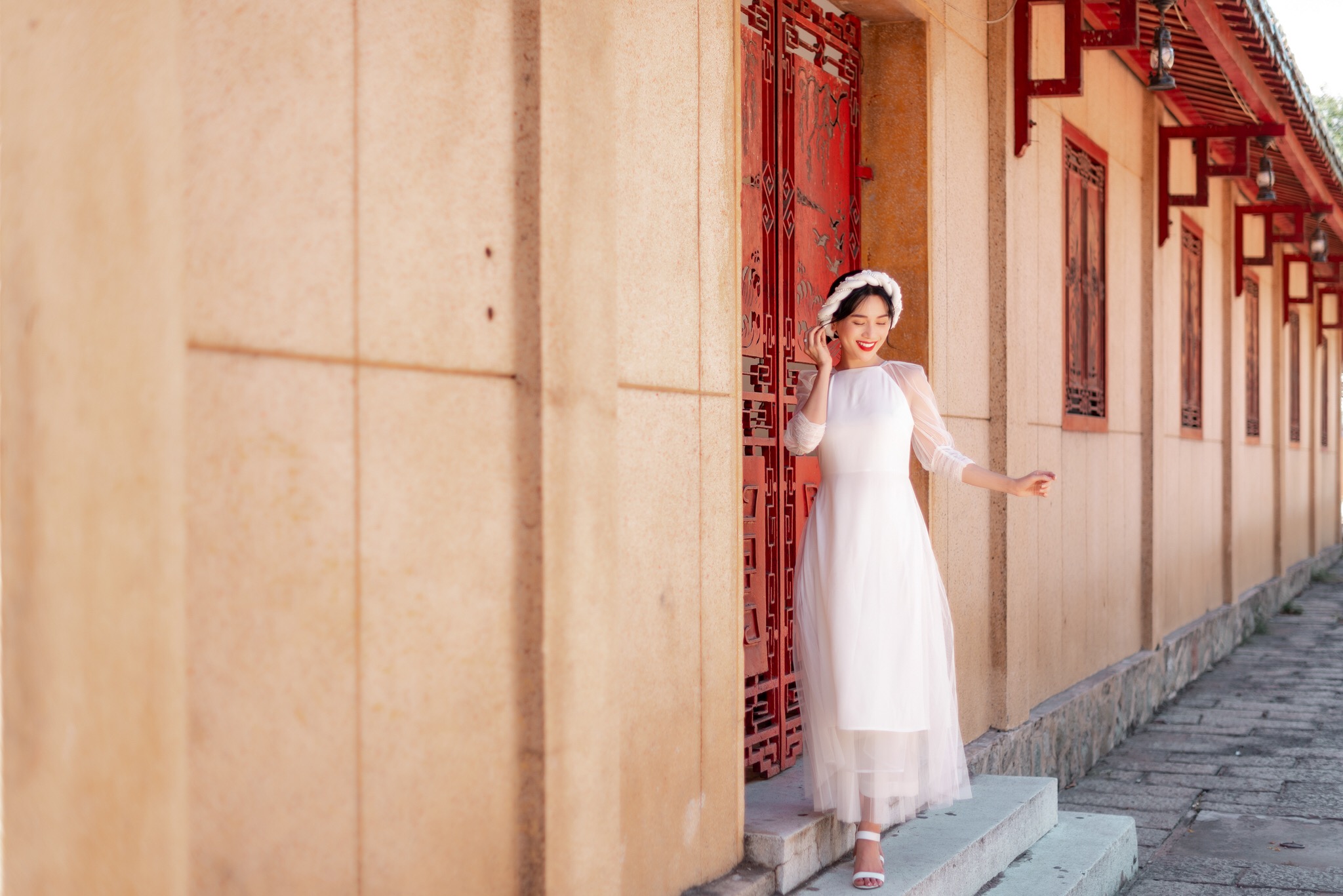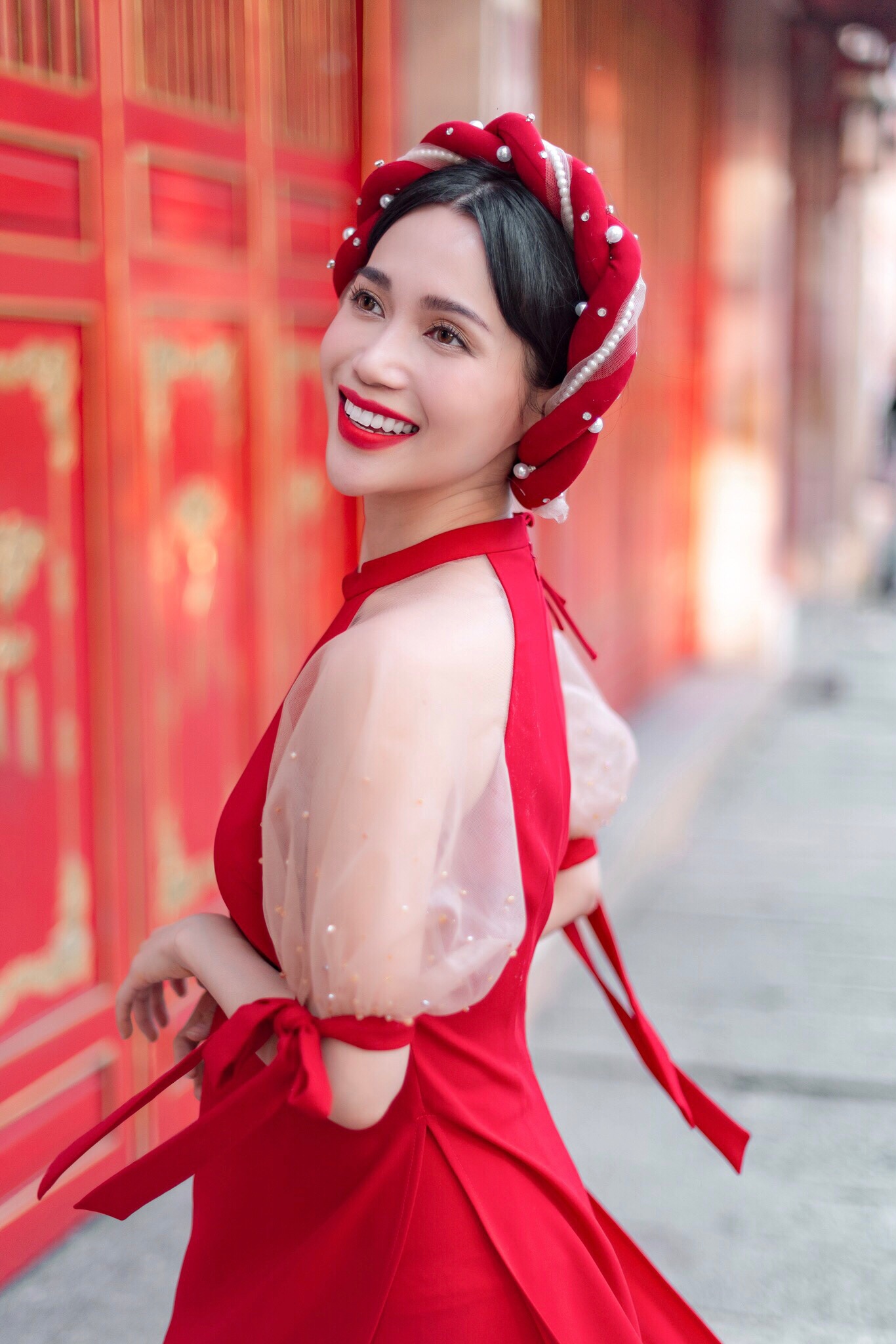 Trong bộ ảnh lần này, Sĩ Thanh diện hai bộ áo dài tông màu trắng đỏ, hai gam màu quen thuộc của Tết. Đặc biệt, thiết kế áo dài Sĩ Thanh chọn mang dáng dấp nữ tính và cổ điển.