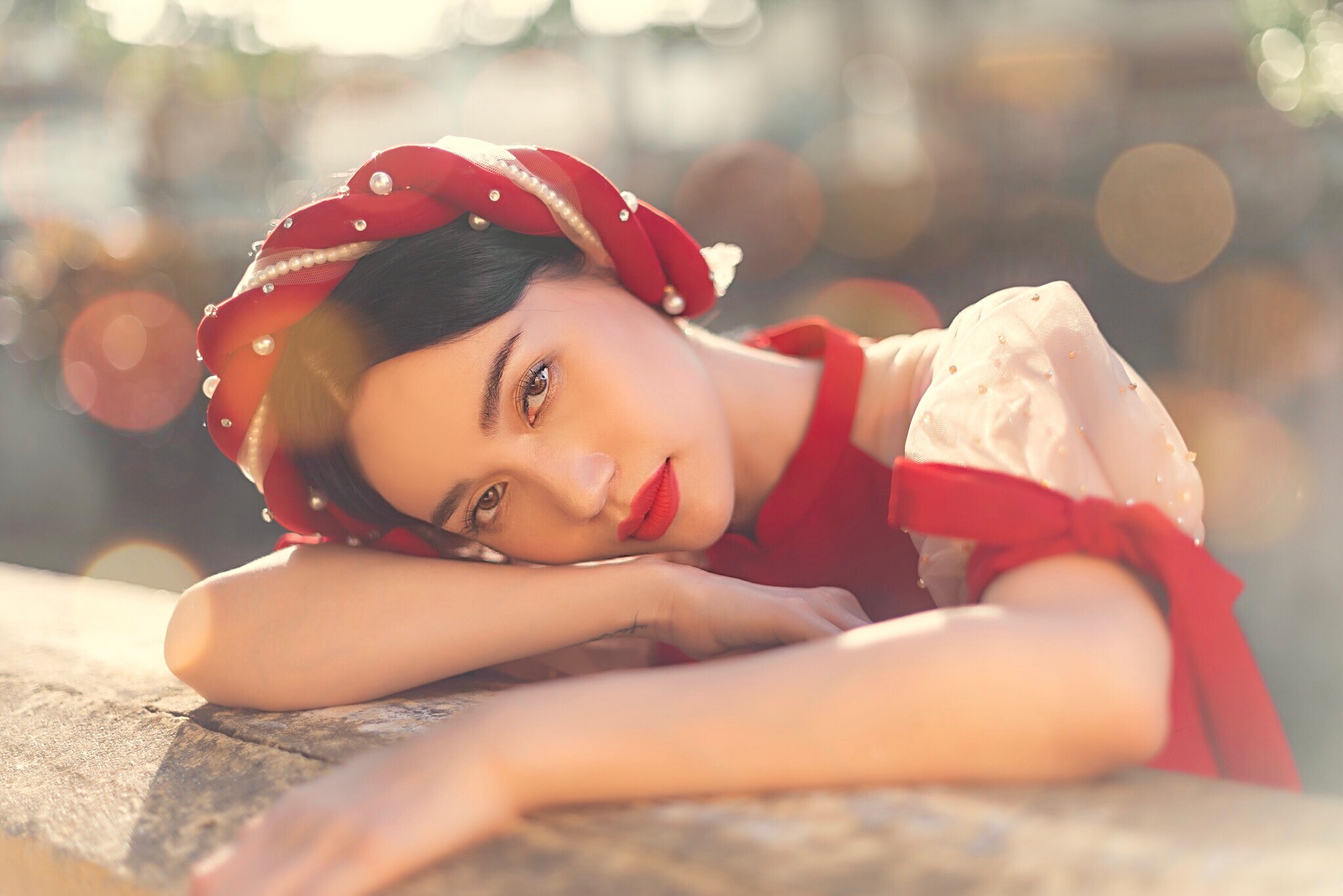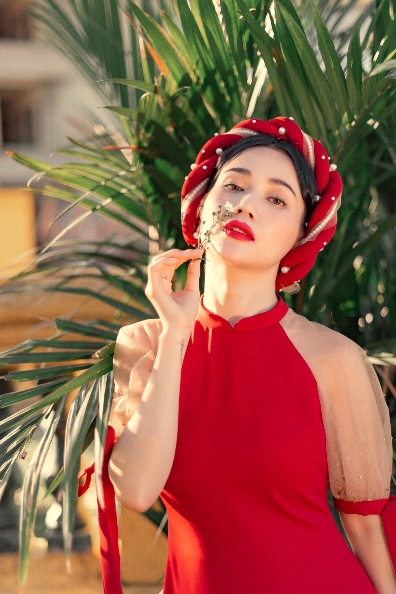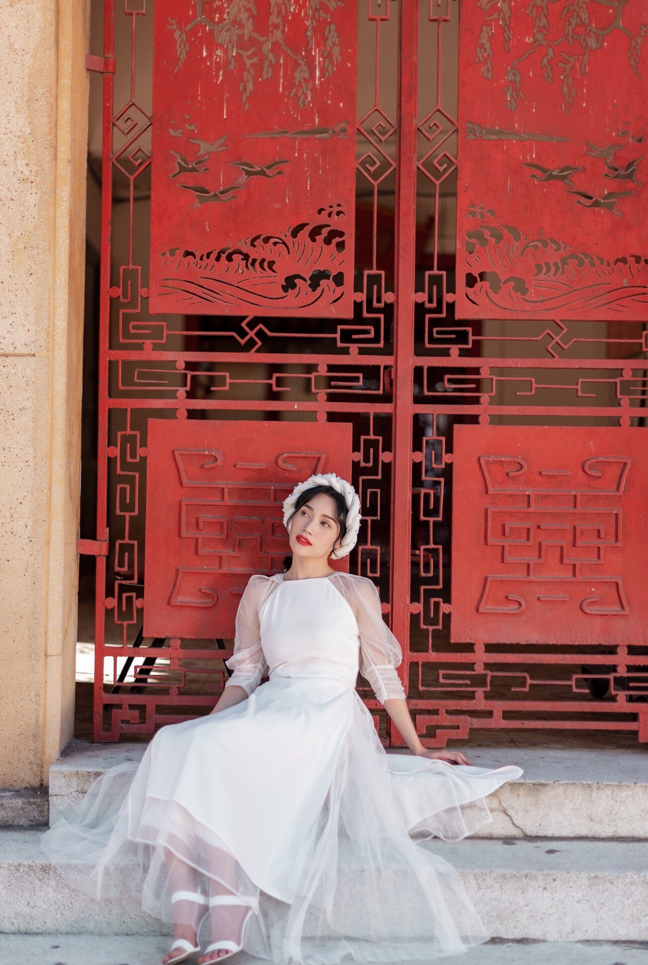 Cánh tay, cổ áo, tà áo, chít eo,… đều được cách điệu để phù hợp với bối cảnh hiện đại. Cộng với gương mặt được trang điểm nhẹ nhàng, thu hút đã giúp bộ ảnh có thêm sức hút.