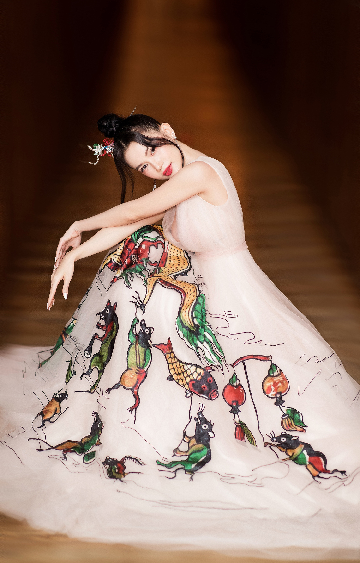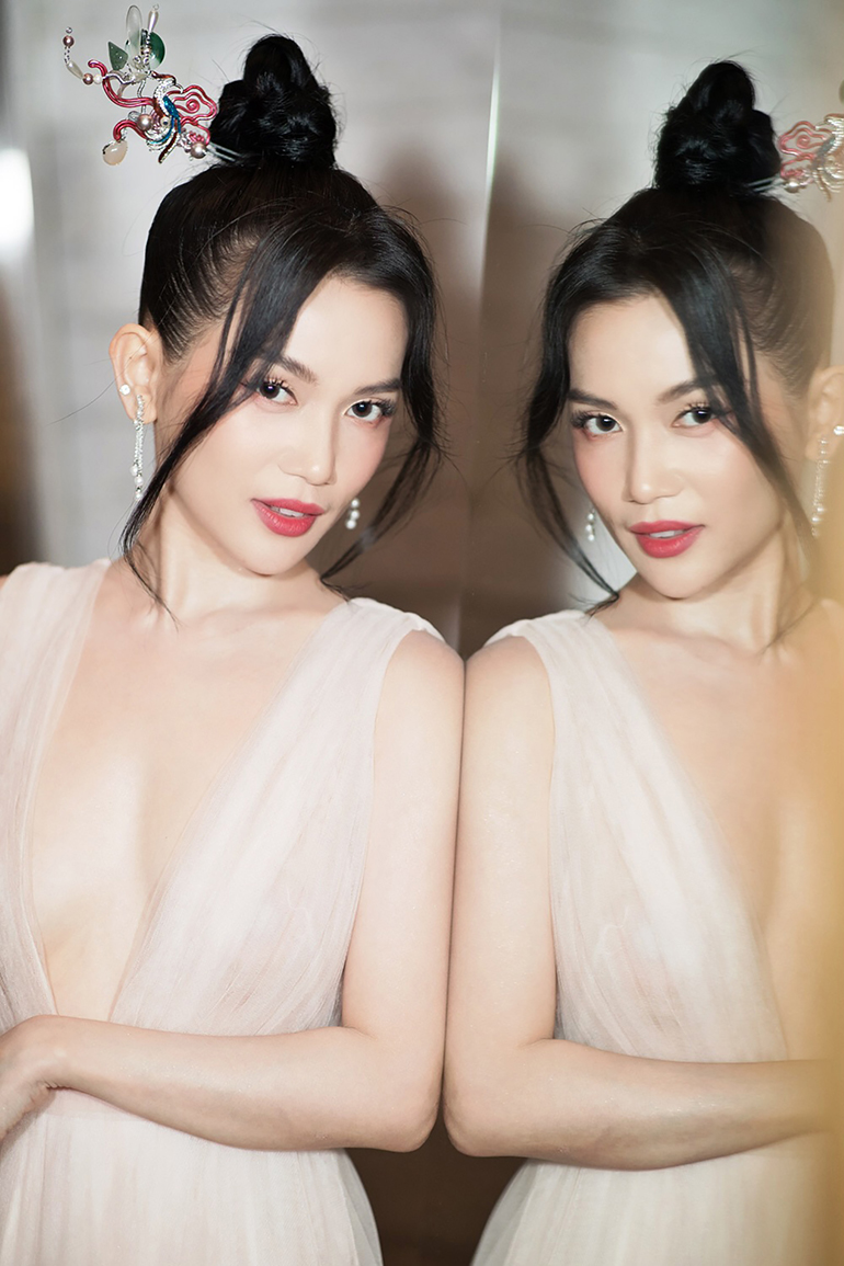Thiết kế sắc hồng nhạt ngọt ngào với điểm nhấn cổ chữ V sâu không chỉ giúp Sĩ Thanh xuất hiện ấn tượng, cô còn được gọi là “Thần tiên tỷ tỷ” xinh đẹp bởi phong thái nhẹ nhàng, thu hút, điềm tĩnh. Cách búi tóc cao kèm phụ kiện thời trung cổ góp phần giúp Sĩ Thanh hoá thân ấn tượng với tạo hình cổ điển.