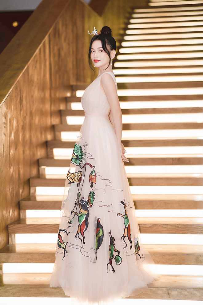 Cô mặc chiếc đầm dạ hội dài tha thướt