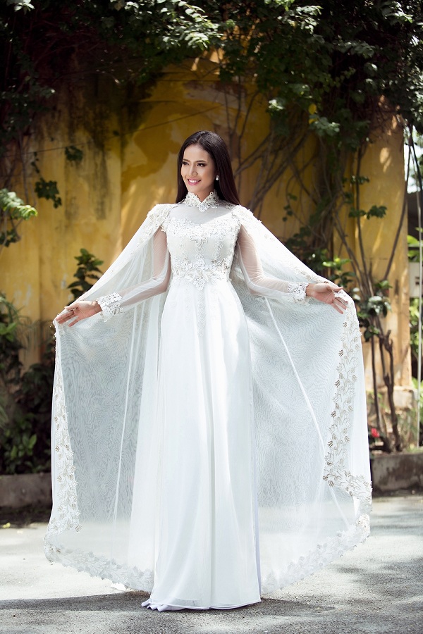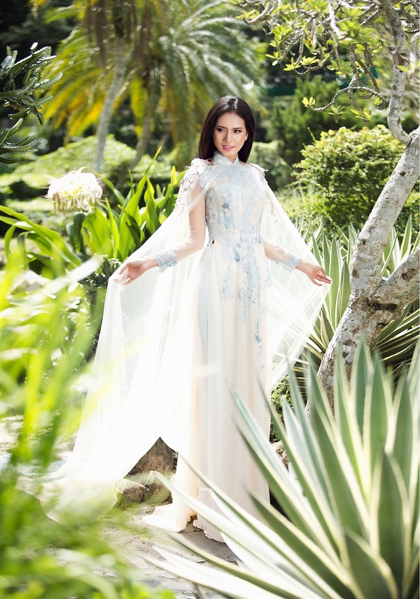 Bên cạnh đó, việc cách điệu phần tà trước ngắn, tà sau dài cũng giúp cho hình ảnh người đẹp lộng lẫy hơn trong từng shoot hình.