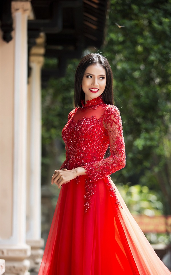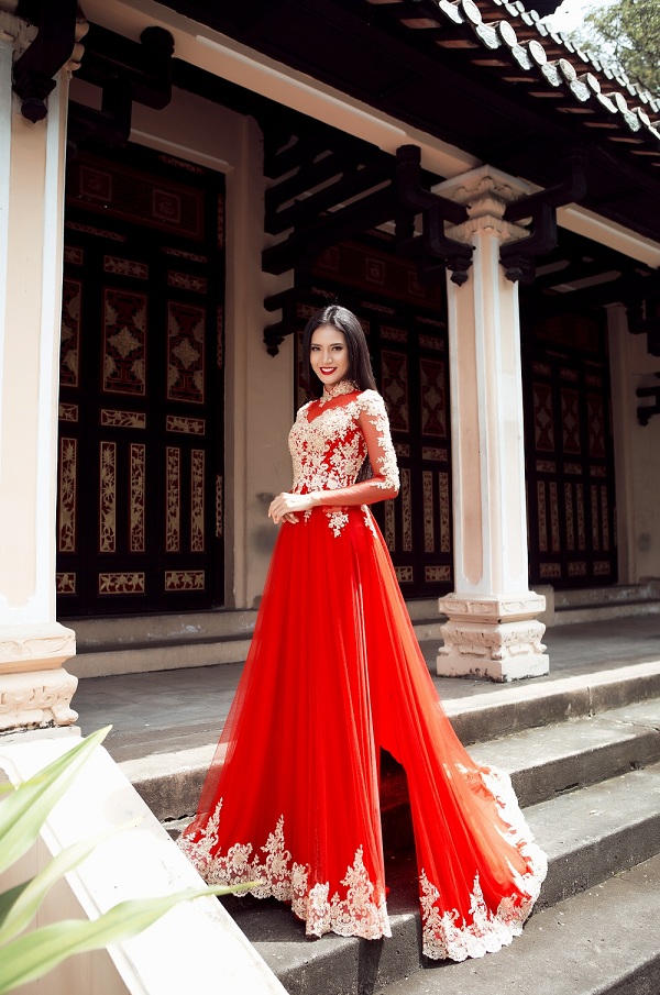 Ngoài thiết kế áo dài tông màu trắng sáng thì thiết kế áo dài tông màu đỏ cũng rực rỡ không kém cạnh khi được người đẹp khoác trên người