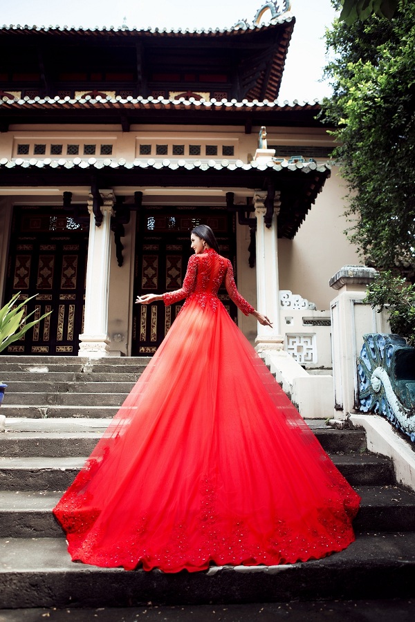 Đặc biệt phía đằng sau chiếc áo dài đỏ như một váy cưới lộng lẫy vô cùng đặc sắc