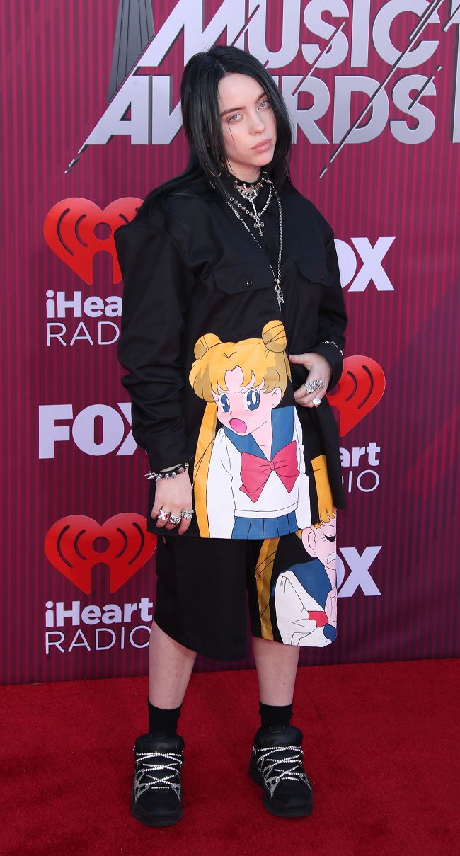 Billie Eilish trong trang phục với hình nhân vật “Sailormoon” Thủy Thủ Mặt Trăng, một nhân vật hoạt hình nổi tiếng của Nhật được cô khoác trên mình khi đến tham dự một sự kiện trên thảm đỏ