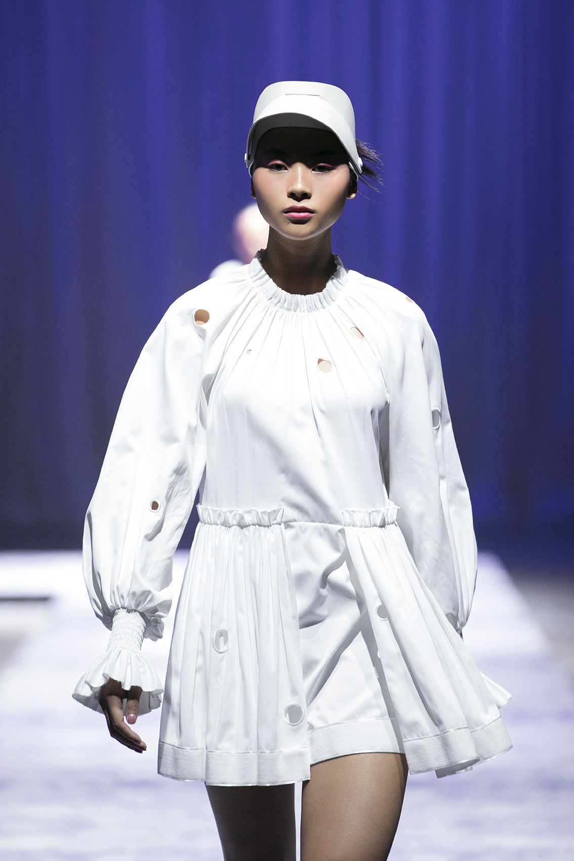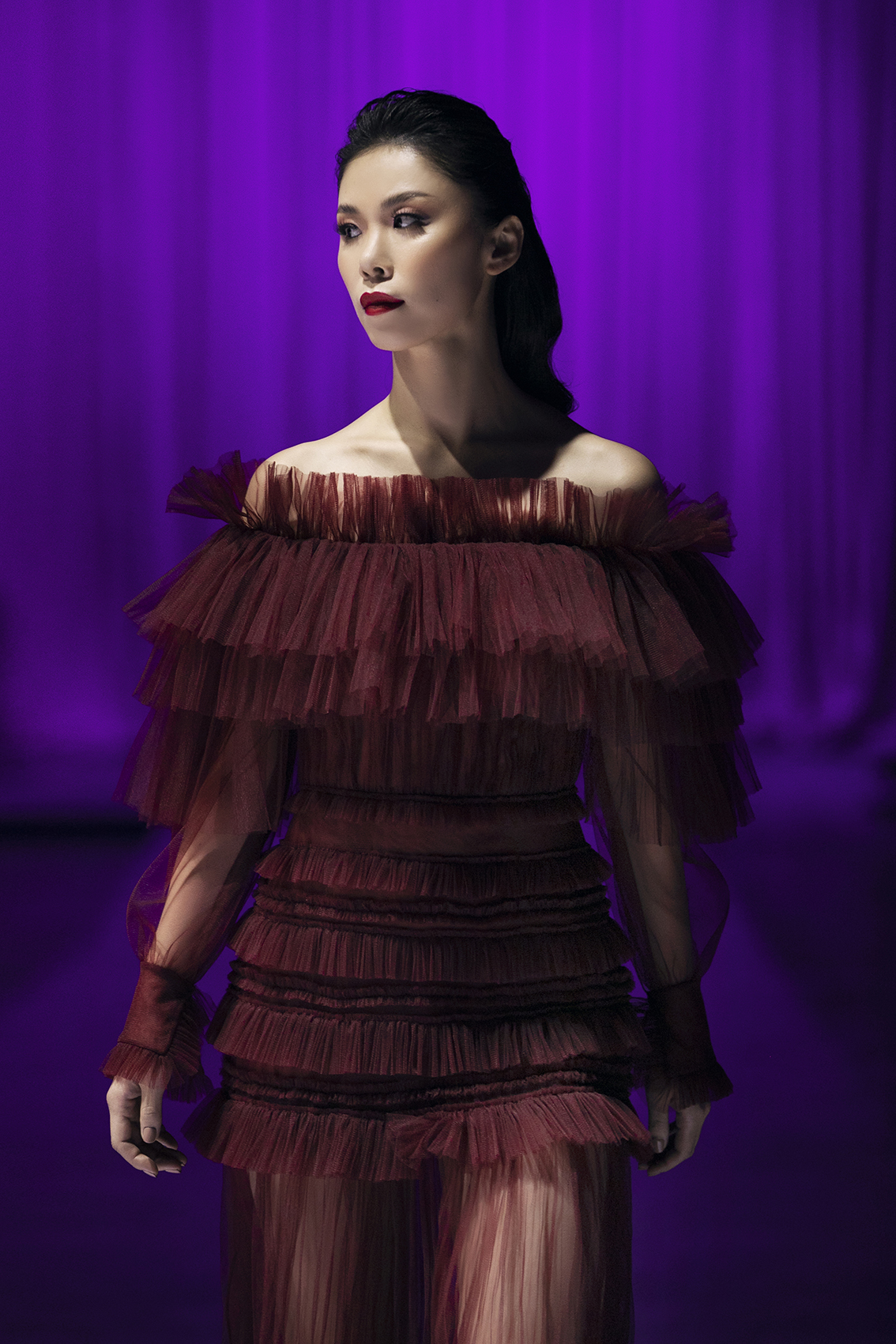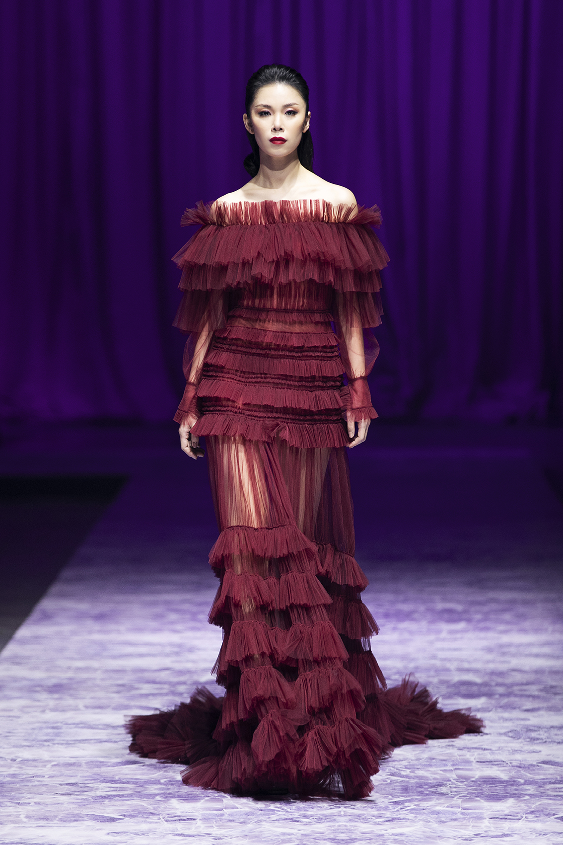 Cô thể hiện một chiếc váy xuyên thấu, được đắp bèo nhún ấn tượng.