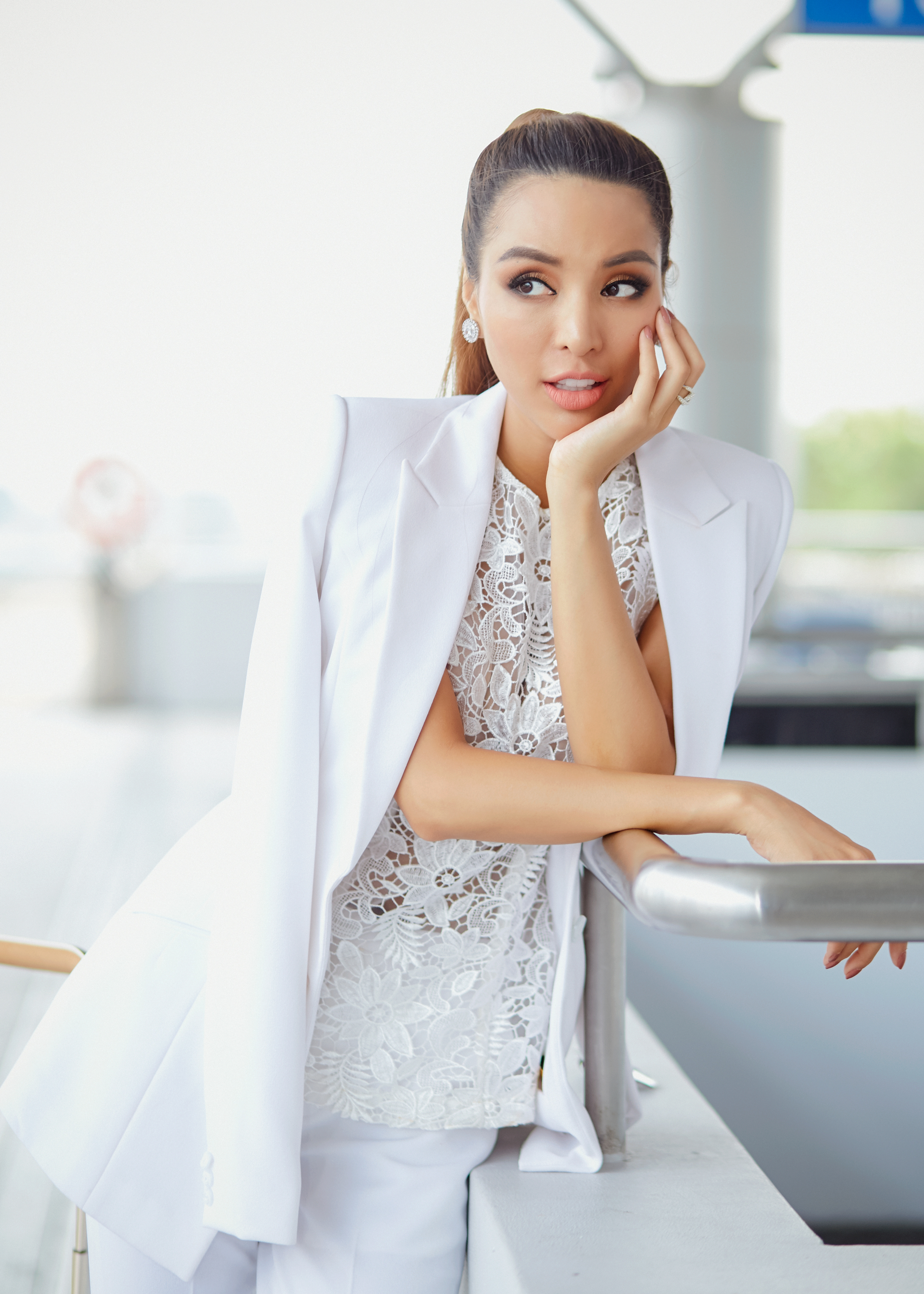 Tại sân bay, Khả Trang diện trang phục vest màu trắng lịch lãm, khoe vẻ mạnh mẽ, cá tính mà vẫn vô cùng gợi cảm với làn da nâu.