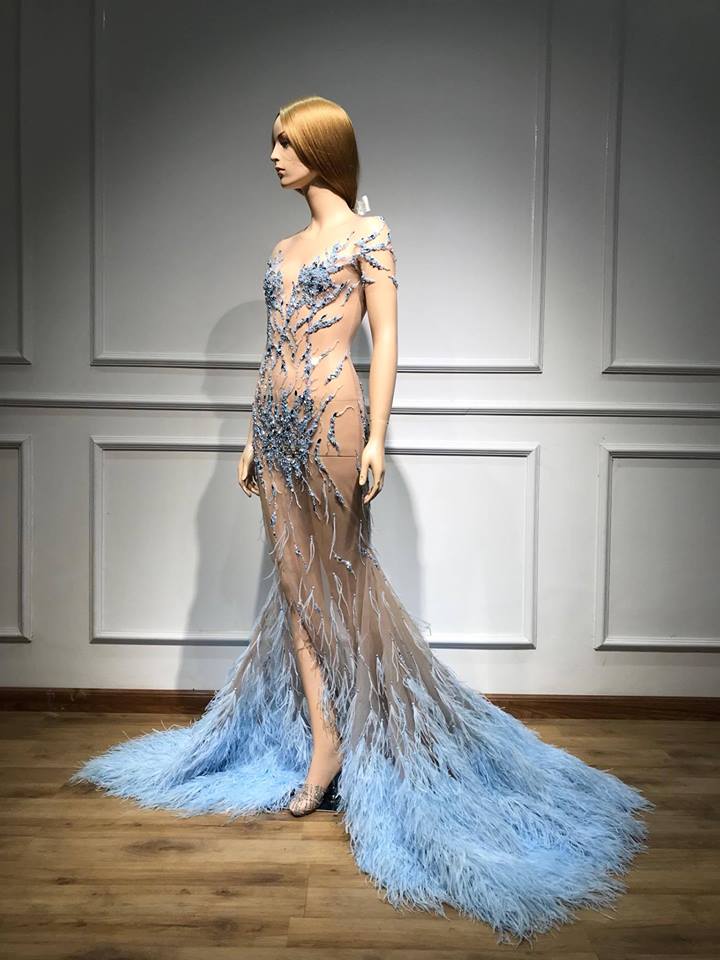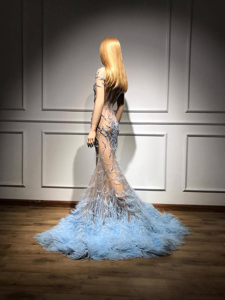 Chiếc đầm được may với lớp vải sheer xuyên thấu và gắn đá tỉ mỉ, tiết chế vừa phải và vẫn phô diễn được trọn vẹn đường cong của Leomie Anderson. Riêng phần đuôi gắn lông vũ cho thấy sự công phu đến từng chi tiết như thường thấy của Lê Thanh Hòa.