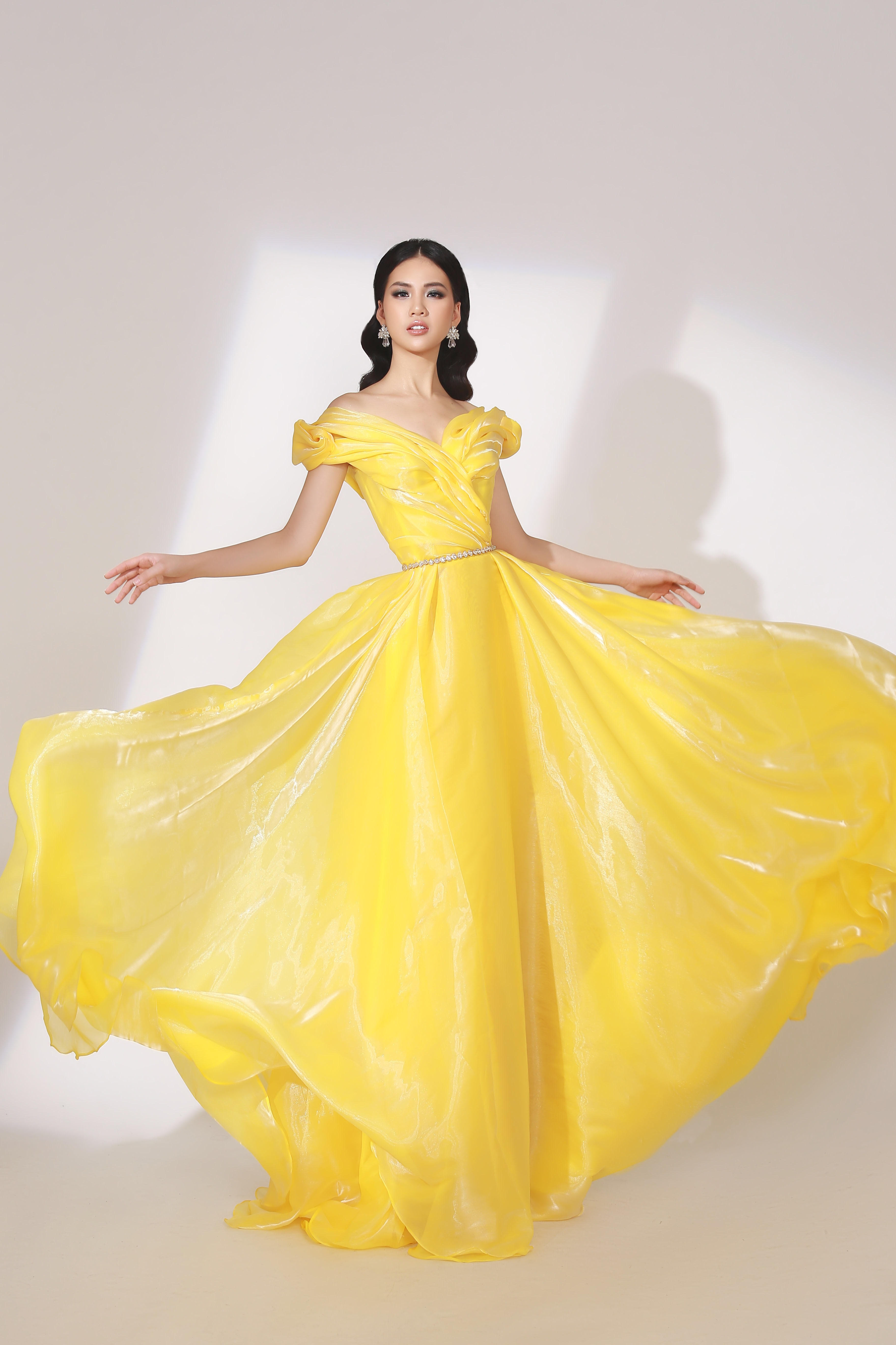 Trong một shoot ảnh, giải Vàng Siêu mẫu được chọn thể hiện chiếc váy vàng xòe bềnh bồng. Cô ngay lập tức “thi triển” kiểu pose dáng tung tà váy ấn tượng.