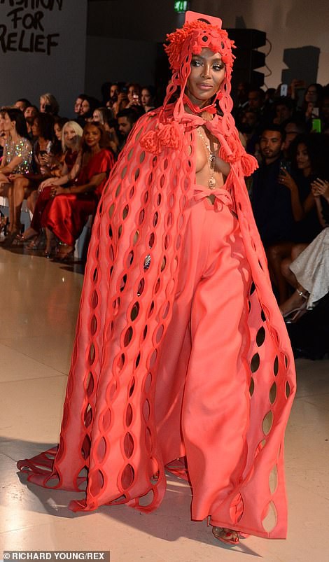 Naomi Campbell mặc hở bạo trong thiết kế váy đen mỏng tang cùng kiểu tóc Barbie Girl đánh sấy phồng