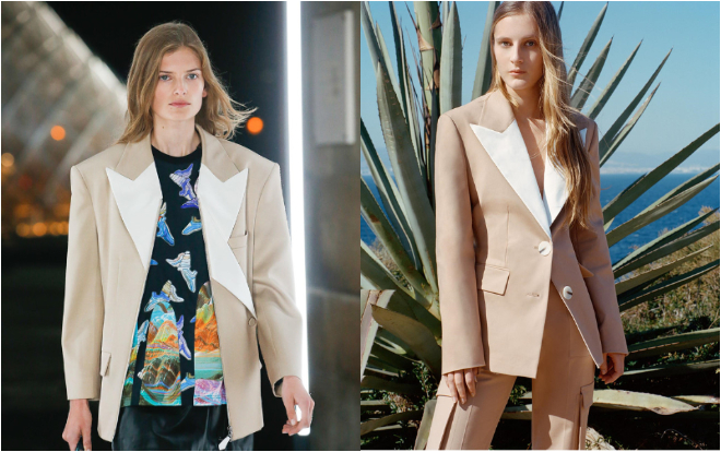 Louis Vuitton là một trong những brand được rất nhiều nhãn hàng nhỏ ưu ái bắt chước theo. Điển hình như áo blazer tông màu be, cắt chéo vạt lạ mắt được thương hiệu bình dân biến tấu nữ tính hơn với phom dáng chiết eo thêm đính nút to trên áo.