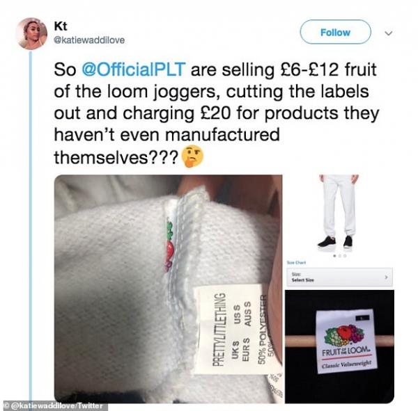 Một khách hàng có tài khoản Twitter tên là @katiewaddilove đến từ Anh đã đăng tải một bức ảnh chụp chiếc quần jogger của thương hiệu PrettyLittleThing. Cô đã update nêu rõ trên trang cá nhân rằng nhãn mác cũ được xé bên dưới nhãn mác của PrettyLittleThing.là tàn dư nhãn mác của Fruit of the Loom, một thương hiệu quần áo có giá khoảng 5 bảng Anh (khoảng 150.000 VNĐ) trong khi PrettyLittle Thing bán với giá cho khách tận 20 bảng Anh ( tầm 615.000 VND).