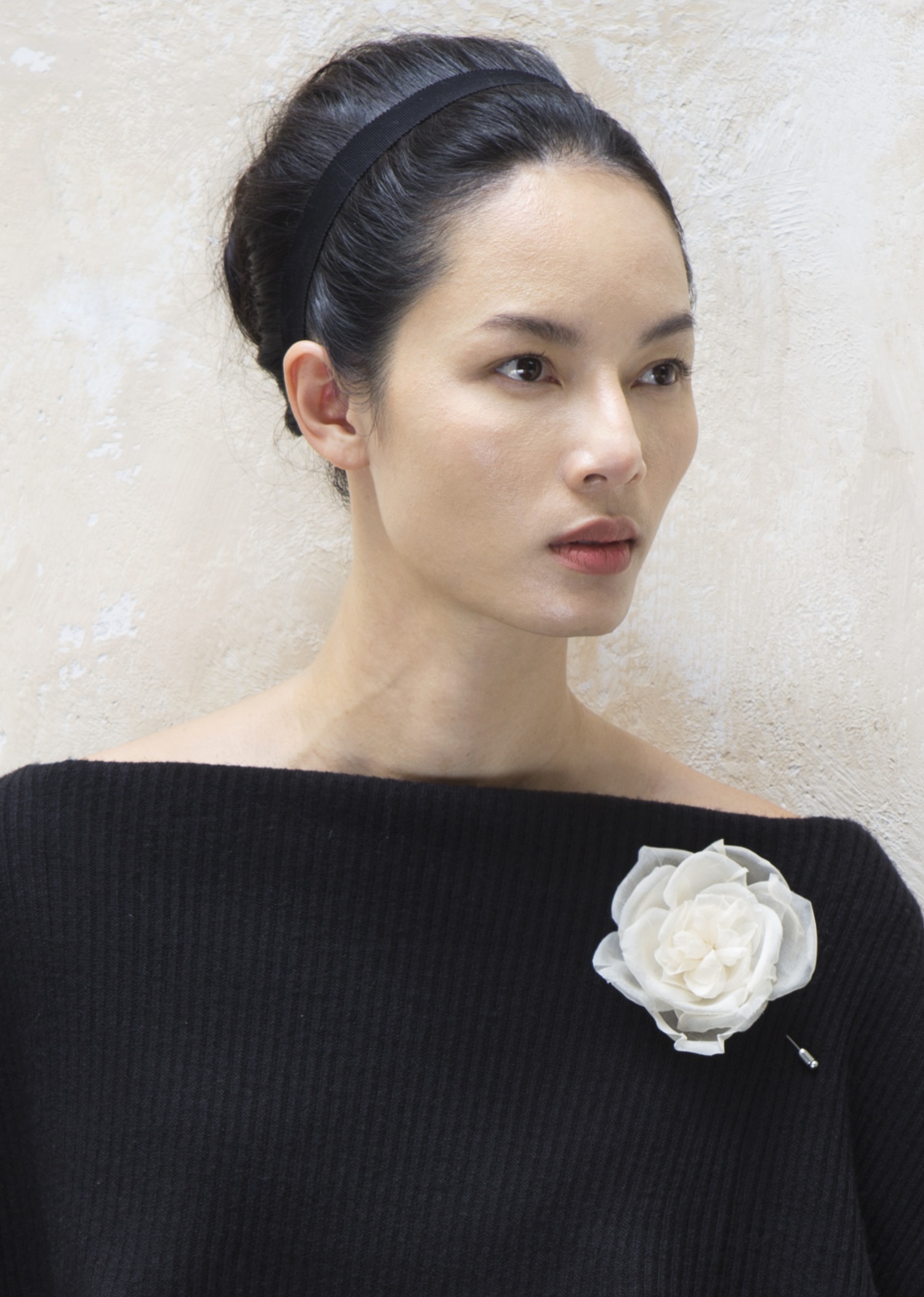 Chi tiết hoa cài được làm tay đã góp phần tạo điểm nhấn cho thiết kế.
