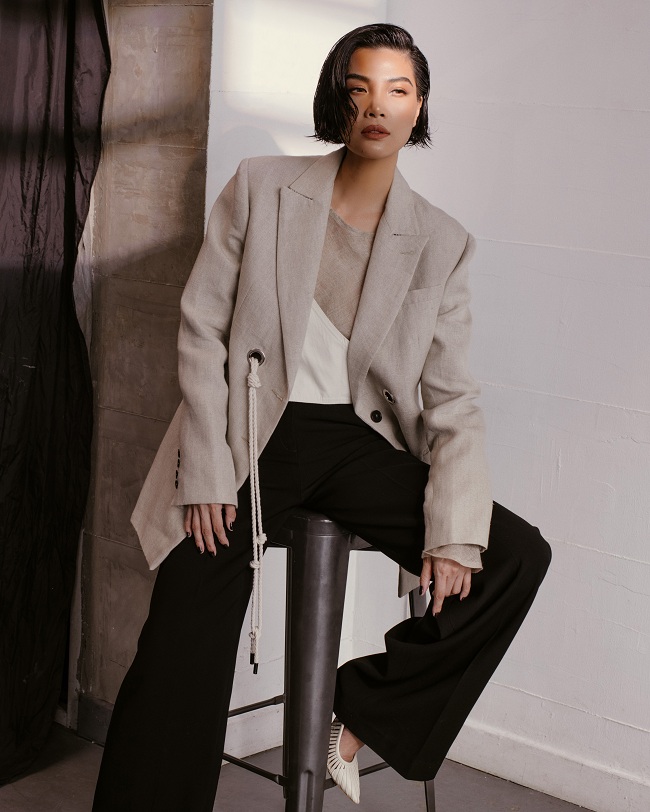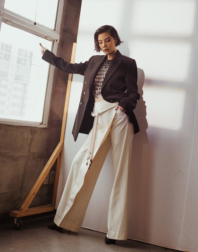 Vũ Cẩm Nhung thể hiện cá tính mạnh mẽ thông qua những bộ suit nam tính cách điệu màu đen đầy thanh lịch