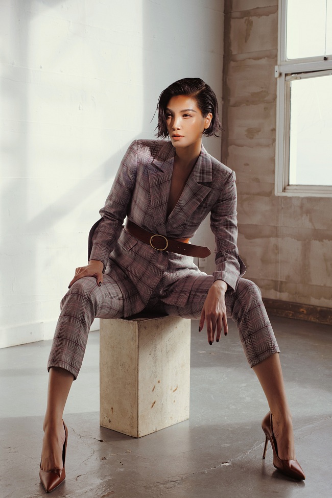Vẻ ngoài thêm trang nhã và thanh lịch hơn khi set đồ vest sọc ca rô nhấn nhá với belt thắt lưng màu nâu “xuyệt tông” với đôi cao gót bít sang trọng.