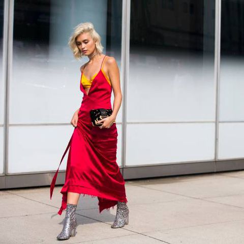 Vẫn là chiếc váy lụa hai dây nhưng khi bạn mix thêm bộ nịt da đen mọi thứ đã thay đổi hoàn toàn