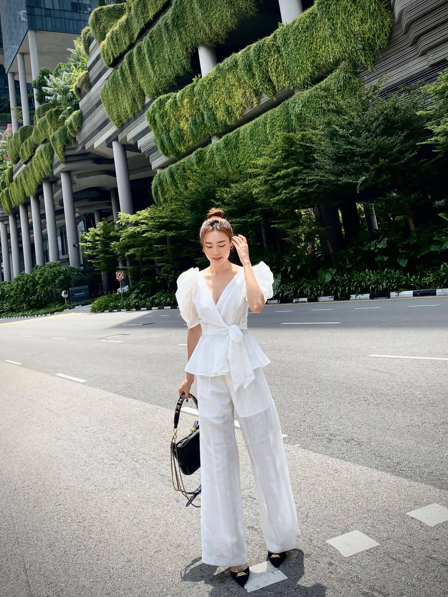 Cùng dáng cổ áo ấy, nhưng lúc xuống phố thì những items Ngọc chọn lại được tiết chế hơn.