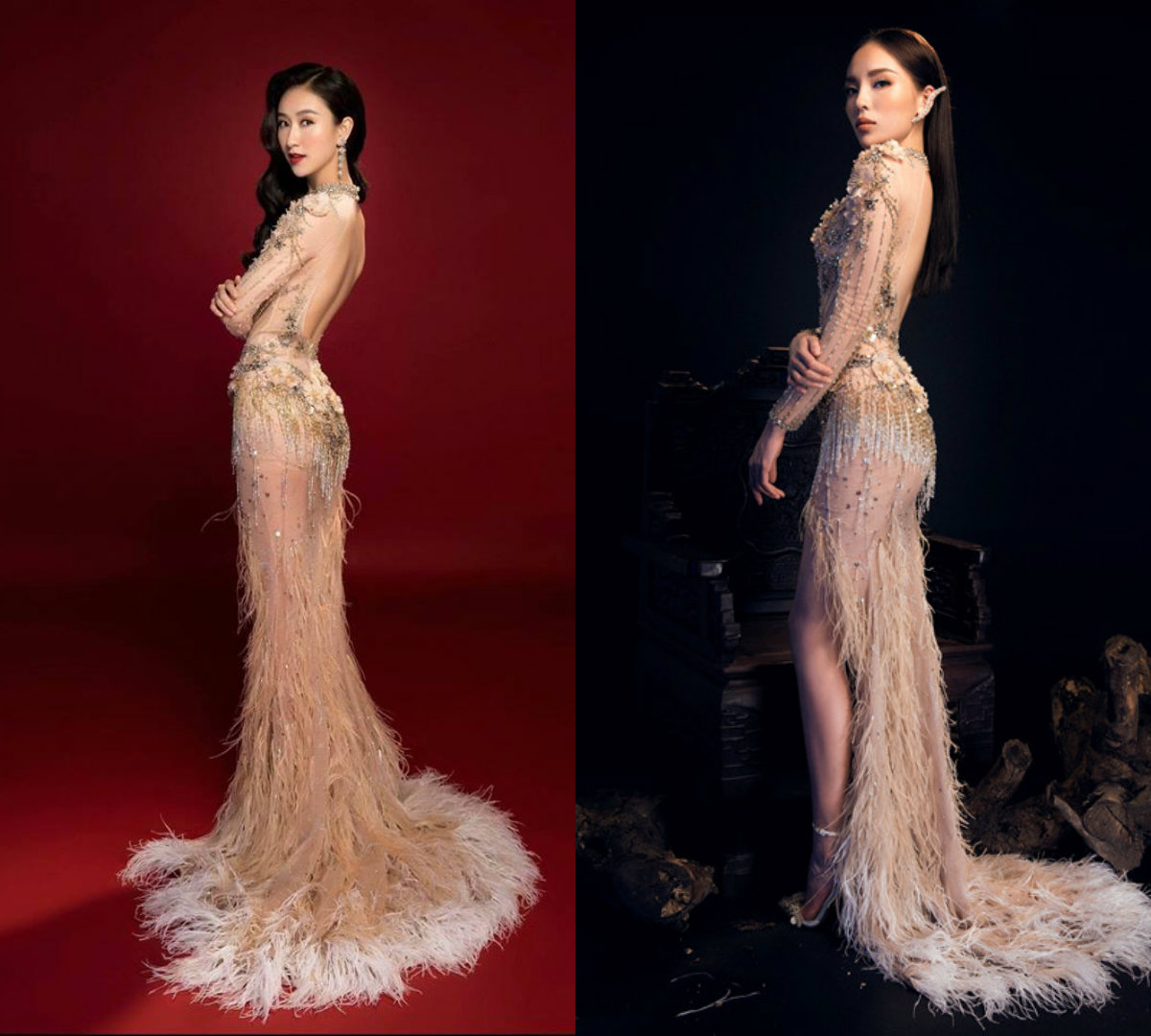 Thiết kế lưng trần được đính kết lông vũ kiêu sa mà Hà Thu và Kỳ Duyên diện khá nổi bật. Song hoa hậu Việt Nam 2014 lại nhỉnh hơn rất nhiều.