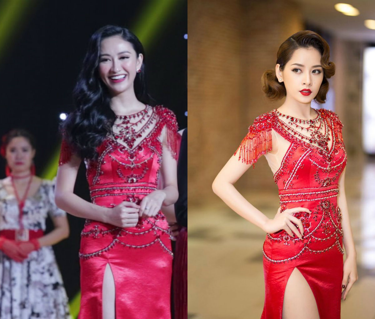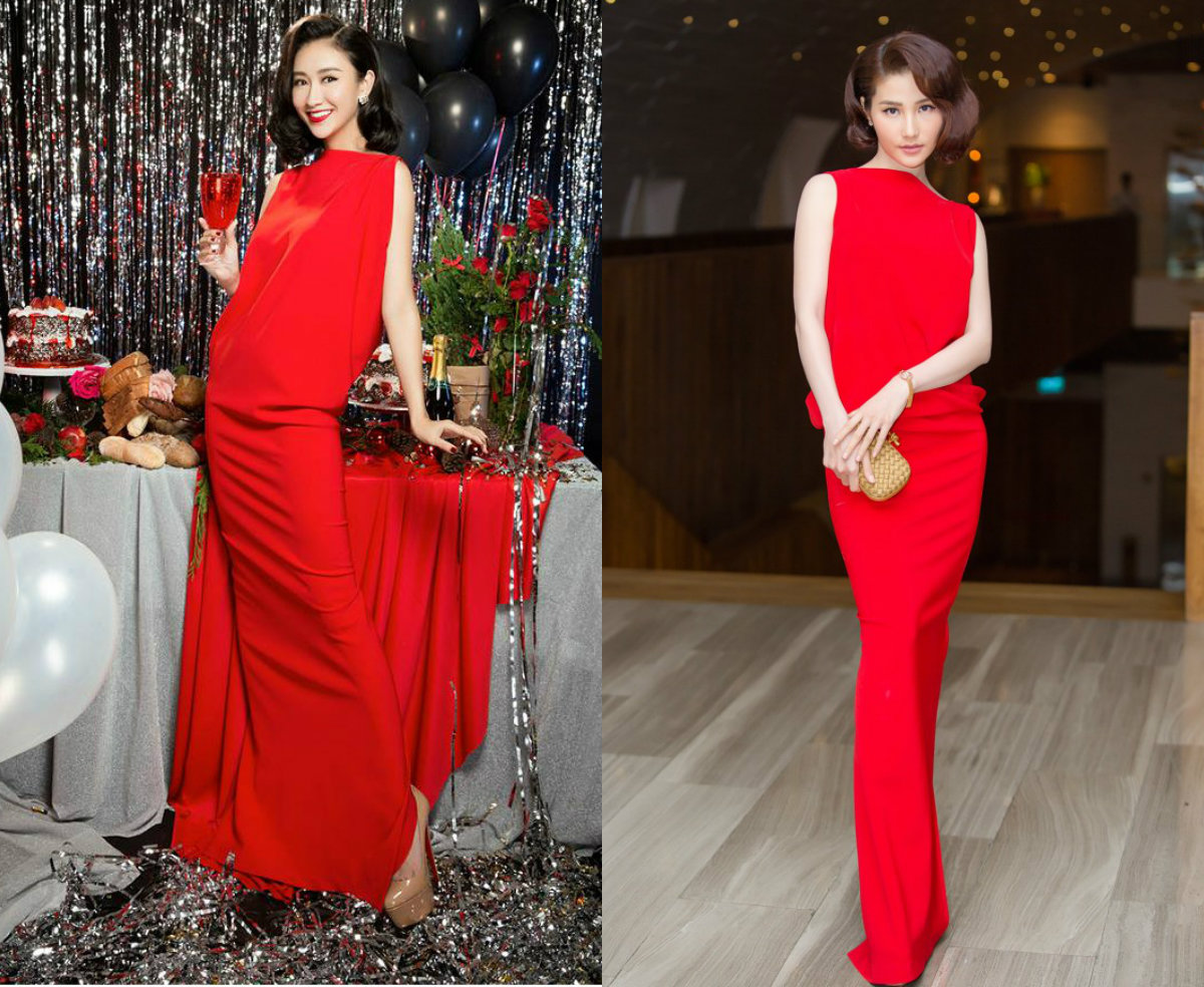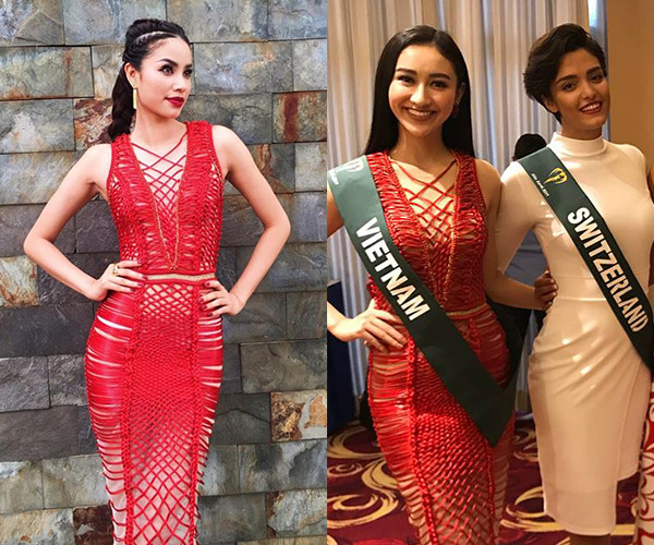 Trong khuôn khổ tham gia cuộc thi Hoa hậu Trái đất, Hà Thu có màn đụng hàng liên hoàn với loạt người đẹp Vbiz. Đây là mẫu đầm đỏ đan dây sành điệu từng được Phạm Hương diện trước Hà Thu. Một lần nữa Phạm Hương được khen mặc đẹp hơn rất nhiều.