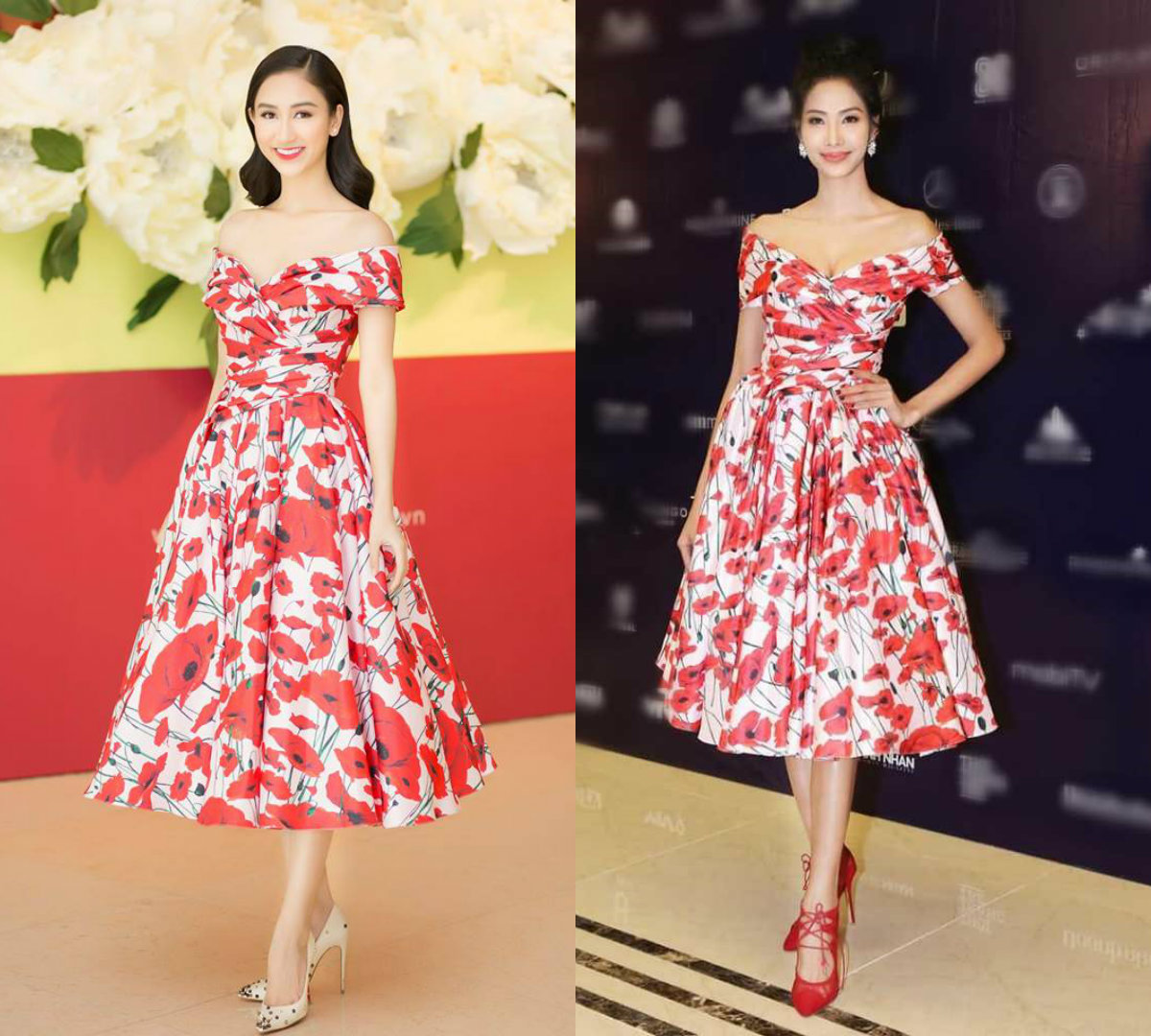 Lộng lẫy và kiêu sa, cổ điển và quyến rũ là những gì mà thiết kế váy xòe chít eo trễ vai nằm trong bộ sưu tập “Poppy” khiến nhiều nàng say đắm. Hà Thu vì quá yêu thích nên đã chọn diện ngay. Cả hai khoe nhan sắc một chín một mười thế nhưng điểm cộng cho Hoàng Thùy đó chính là đôi bông tai làm tăng vẻ điệu đà cho bộ cánh. Trong khi đó Hà Thu thiếu đi yếu tố quan trọng này.