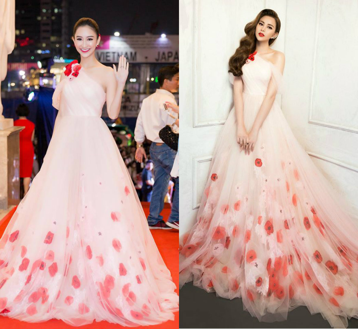 Trong thiết kế lệch vai được Lê Thanh Hòa “đo ni đóng giày” cho Đặng Thu Thảo lại được Hà Thu “mượn” để diện lại. Chính vì vậy thần sắc của cô không qua “thần tiên tỷ tỷ” cũng là điều dễ hiểu.