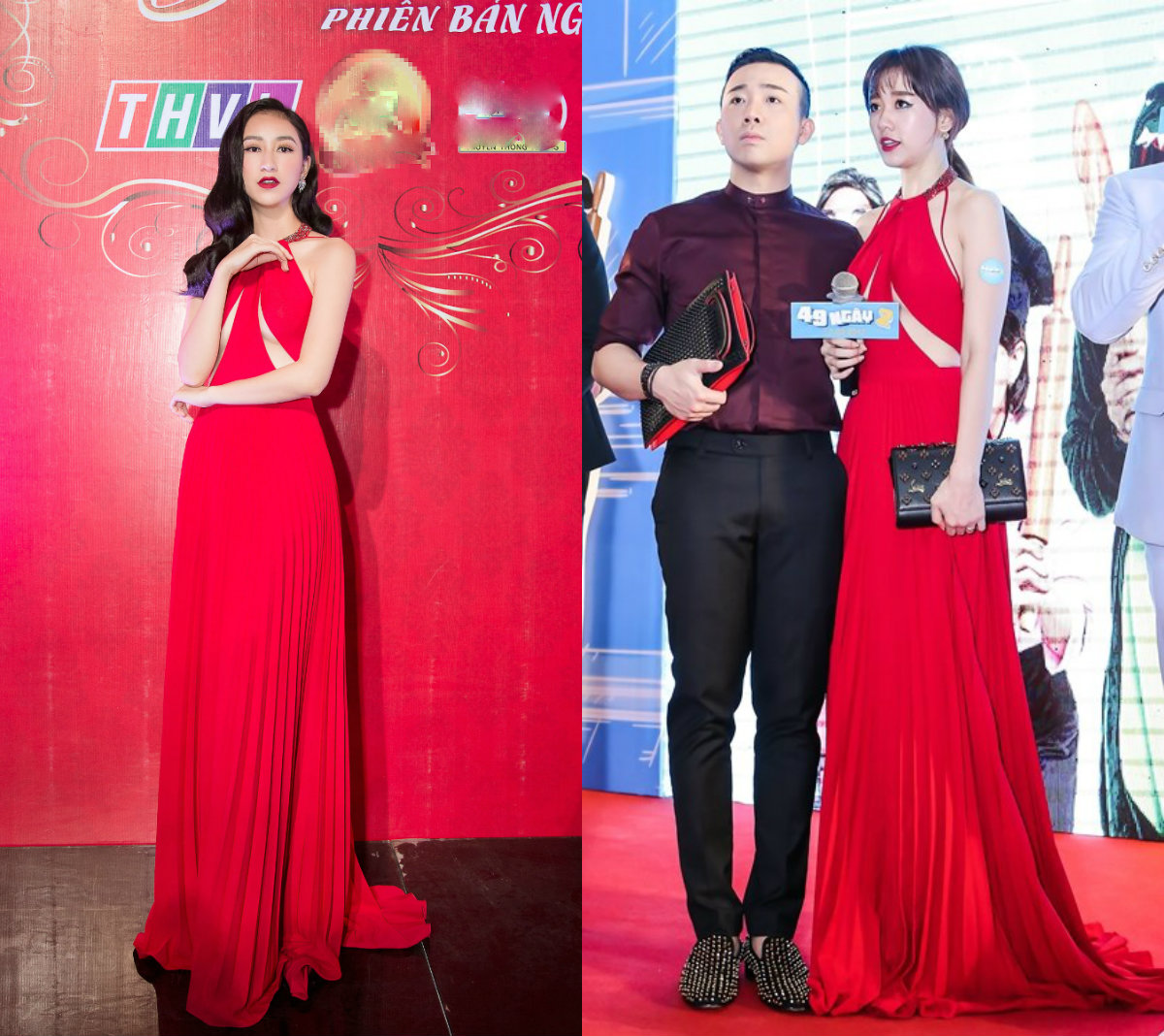 Hà Thu diện chiếc váy đỏ trị giá 1.200$ (khoảng 22,6 triệu đồng) của NTK Lê Thanh Hòa nhưng cũng nằm trong diện “đồ cũ” mặc lại. Chiếc đầm được cắt xẻ khá nhiều chi tiết ở phần ngực, hông và lưng giúp nữ ca sĩ Hari Won tỏa sáng trên thảm đỏ đầu năm ngoái.