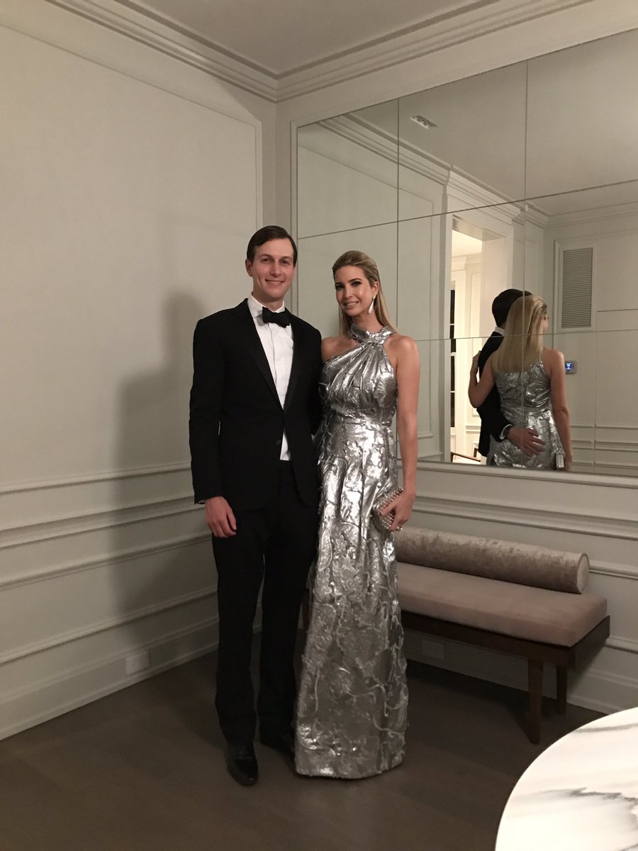 Thêm một thiết kế giúp Ivanka ghi điểm, đầm dạ hội gam màu ánh bạc nền nã, kết hợp cùng ví cầm tay và hoa tai tông ánh kim, cô nàng xinh đẹp sánh bước cùng chồng, nhà bất động sản Jored Kushner.