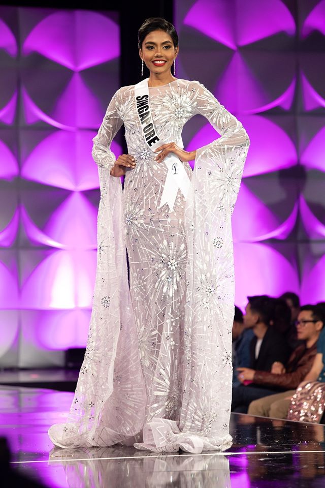 Hoa hậu Singapore có làn da nâu rám nắng, cô đã quyết định diện váy trắng nhằm tôn lên nét hoang dại của mình.
