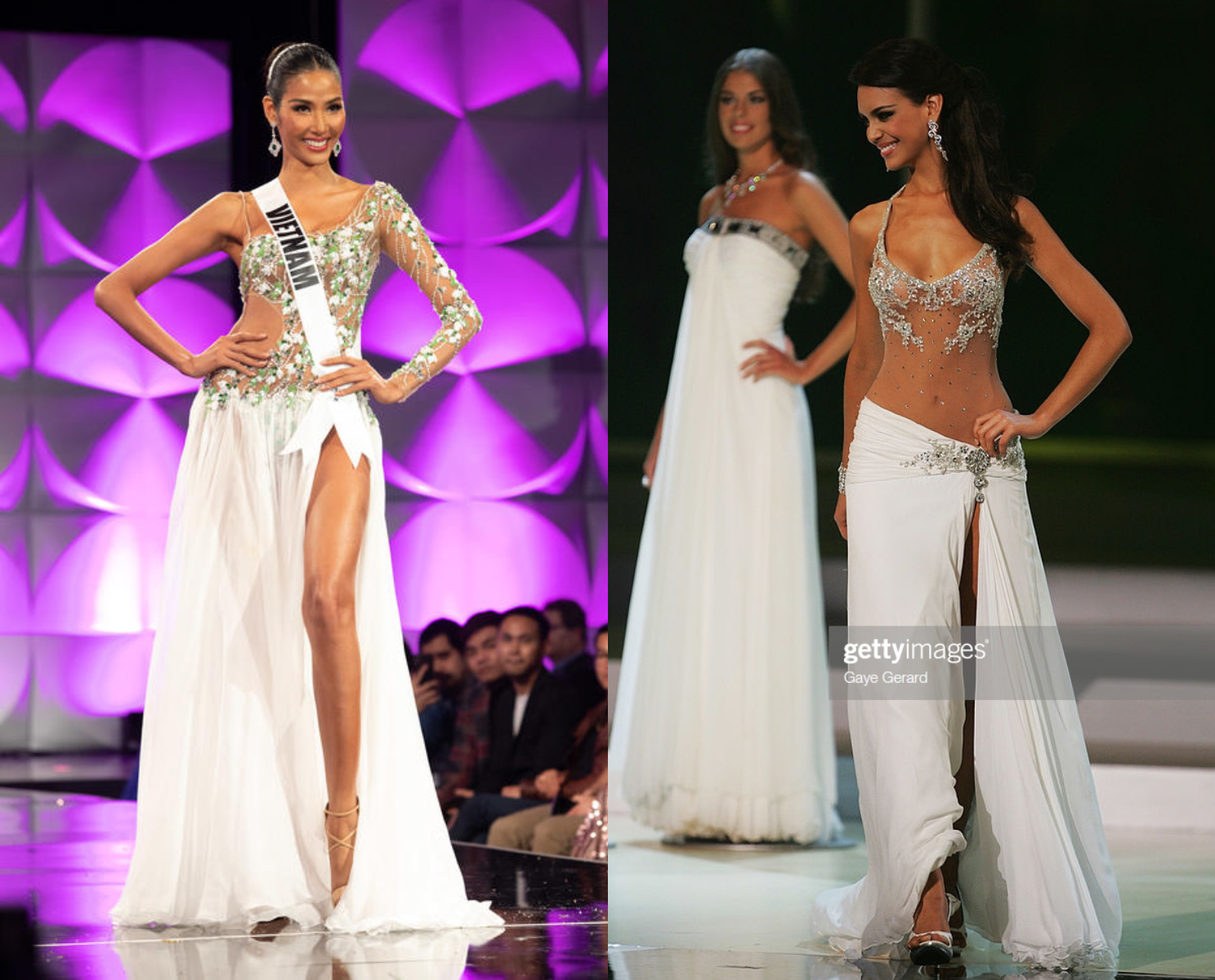 Trong 14 sắc phục trắng ở Miss Universe 2019, thiết kế của Hoàng Thùy được khán gia quốc tế bình chọn là trang phục ấn tượng nhất. Không những vậy, bộ cánh còn được mang ra so sánh với thiét kế của đàn chị là cựu Á hậu 4 - Miss Universe 2008 người Mexico - Elisa Nájera.