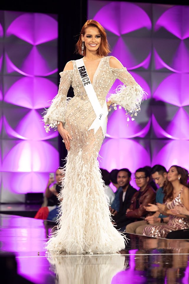 Cũng trong đêm thi bán kết Đương kim Miss Universe 2019 diện váy trắng kết hợp áo choàng lộng lẫy. Được biết thiết kế này cùng thương hiệu với chiêc váy “biển xanh, cát vàng” của Zozibini Tunzi mặc trong đêm chung kết.