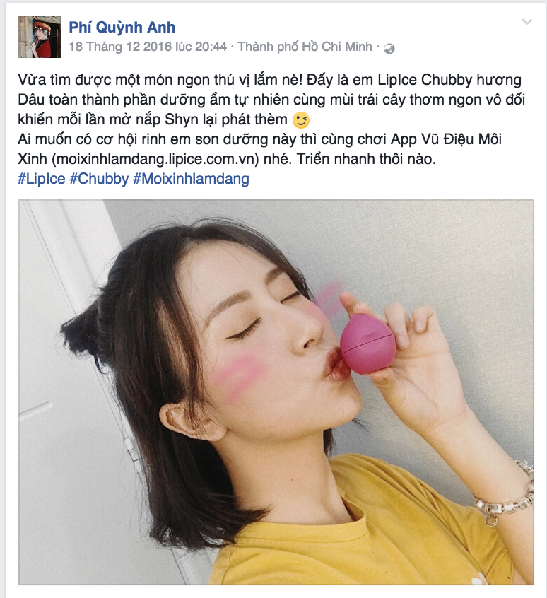 “Món ngon” LipIce Chubby thơm mùi trái cây chứa thành phần dưỡng ẩm tự nhiên đã ghi điểm tuyệt đối với cô nàng Quỳnh Anh Shyn.