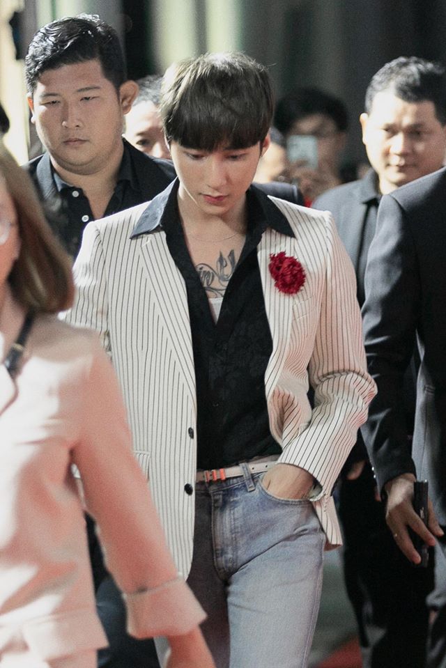 Trước đó trên sân khấu âm nhạc, Sơn Tùng cũng kết hợp chiếc nơ này với một chiếc áo vest màu đen.