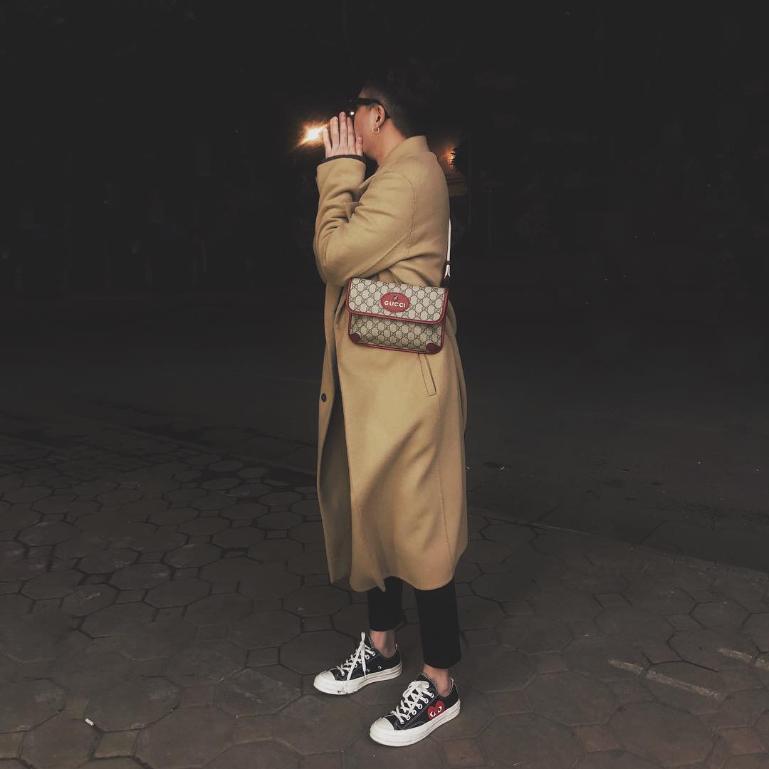 Stylist Hoàng Ku mix áo măng tô dáng dài màu đất với quần âu đen và sneakers cổ thấp đơn giản. Đặc biệt, điểm nhấn cho cả oufit này chính là chiếc túi đeo chéo sang chảnh của Gucci.