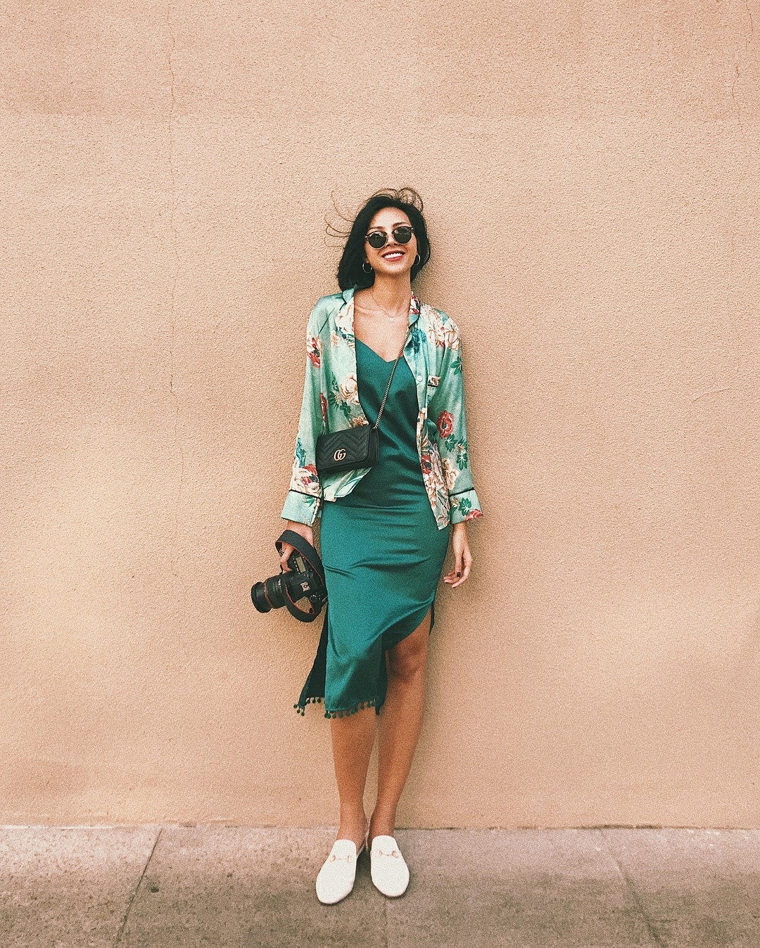 Siêu mẫu Minh Triệu không hổ danh là một trong những cái tên có gout ăn mặc siêu chất. Với màu xanh pine huyền bí từ váy hai dây xẻ tà, chân dài mix với chiếc kimono hoa tùng tone. Đôi mules màu trắng và chiếc mini bag của Gucci là hai phụ kiện giúp cho cả set đồ được nâng cấp hơn.